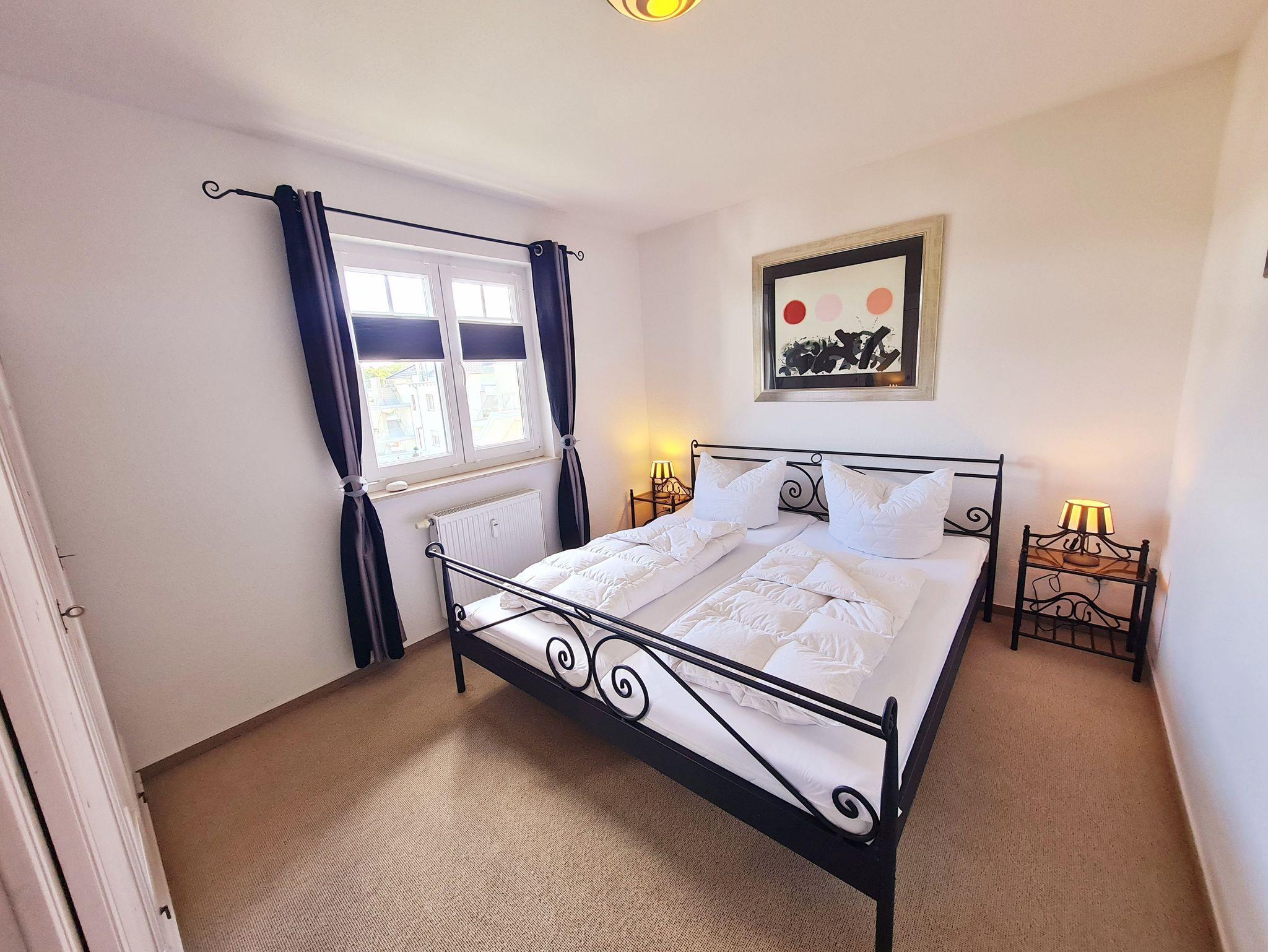 • Schlafzimmer: Doppelbett mit zwei Einzelmatratzen 90x200 m, Schrank, Nachttische + Lampen, Vorhänge zur Verdunklung