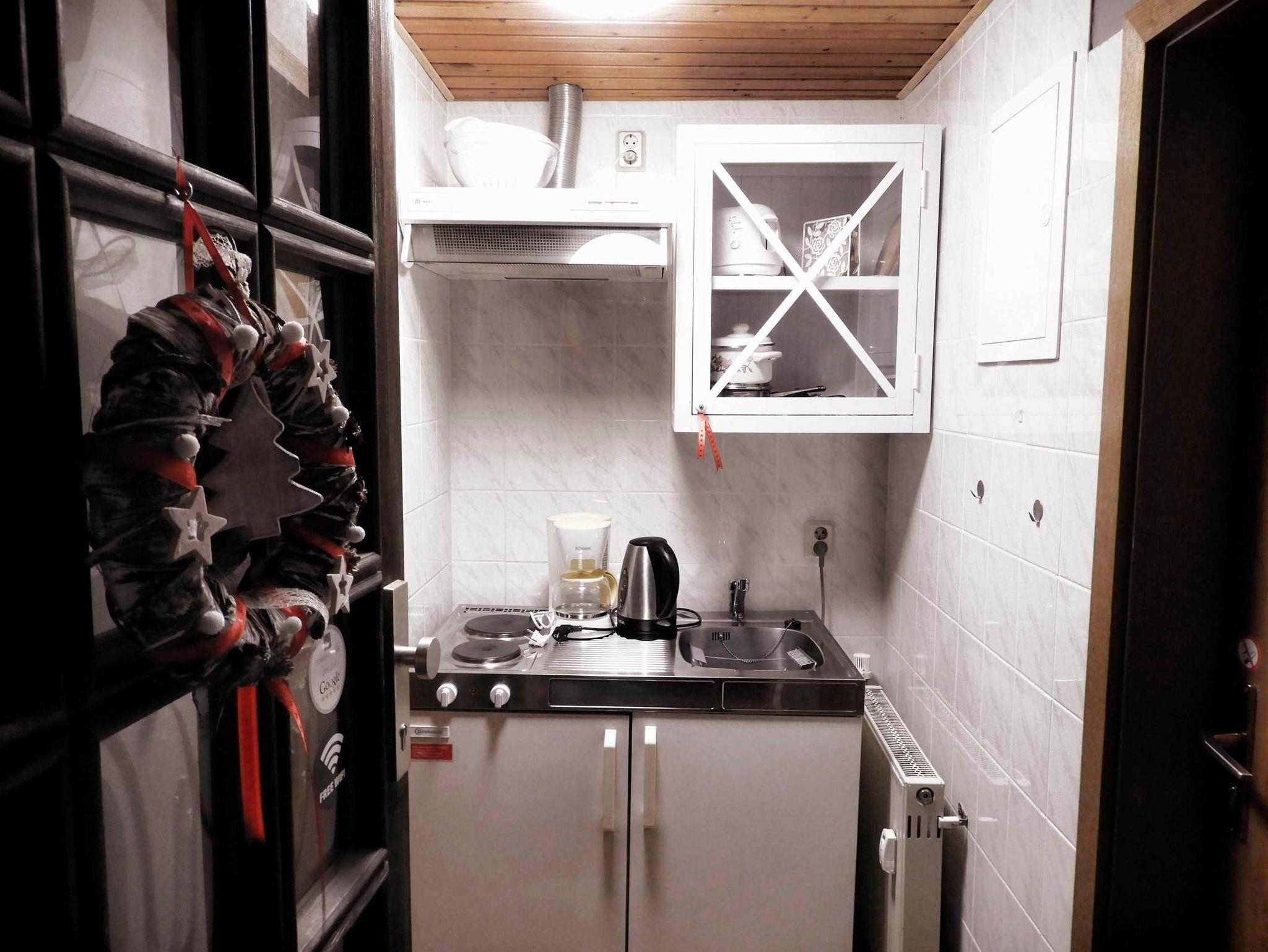 Die außerhalb des Ferienzimmers gelegene Küche wird gemeinsam mit dem Ferienzimmer Strandhexe genutzt. Die Küche ist komplett ausgestattet mit Kühlschrank, Tiefkühlschrank (3 Fächer), Herd (4 Ceranfeld-Kochfeldern), Backofen, Mikrowelle, Kaffeemaschine, Wasserkocher und Toaster. Es gibt einen großen Esstisch sowie ausreichend Geschirr.