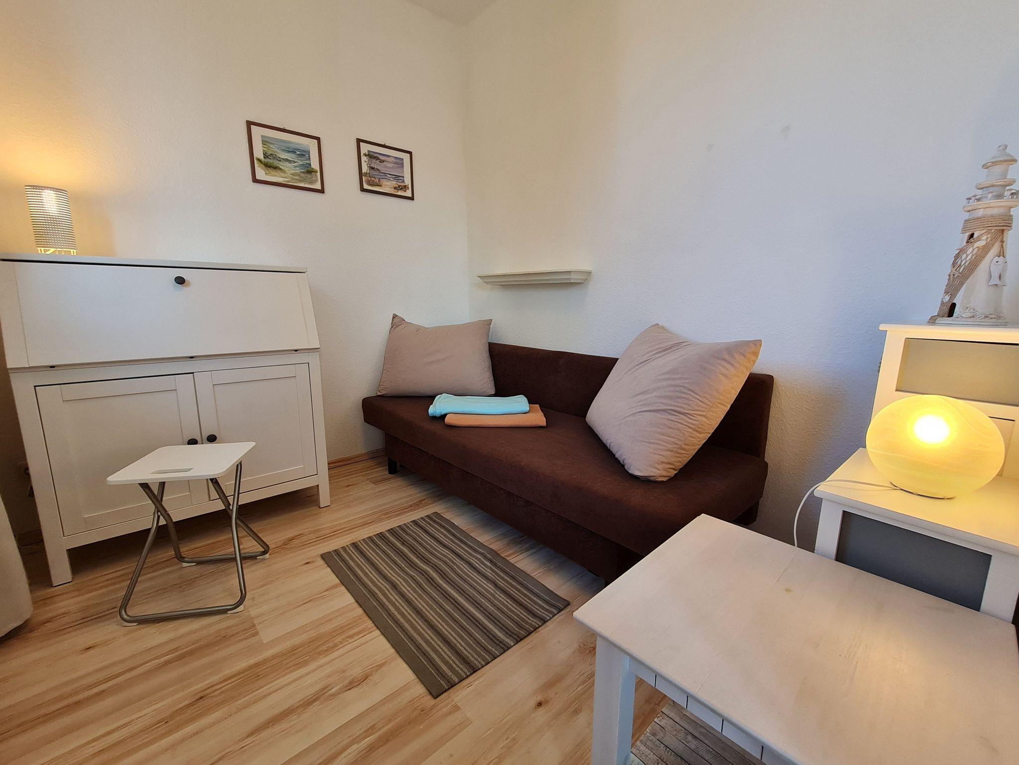 • Schlafzimmer II: Schlafcouch Textil mit 120x180 cm, Tisch, kl. Schrank, CD-Radio, Leselampe, Plissees und Verdunklung durch Vorhänge