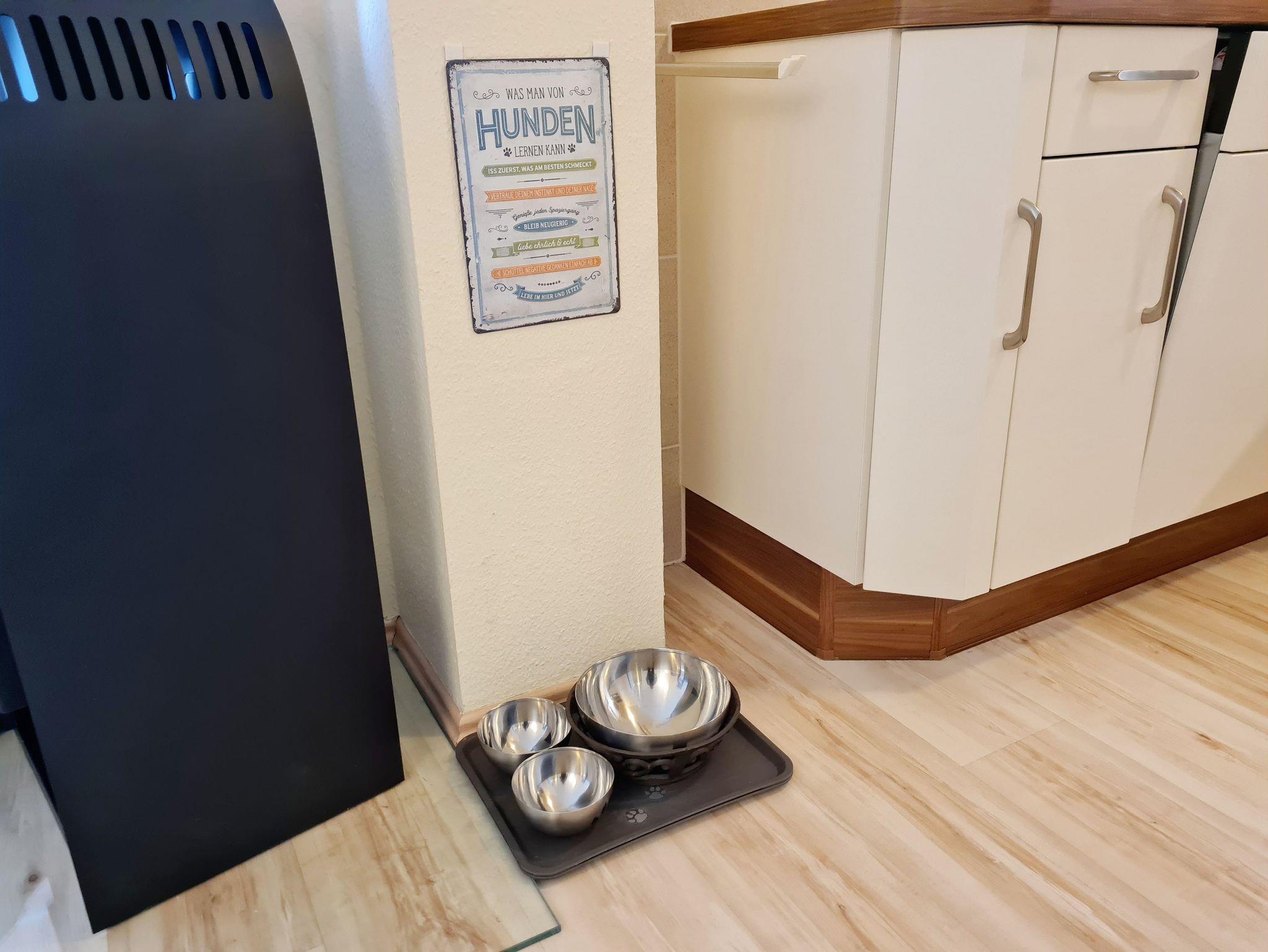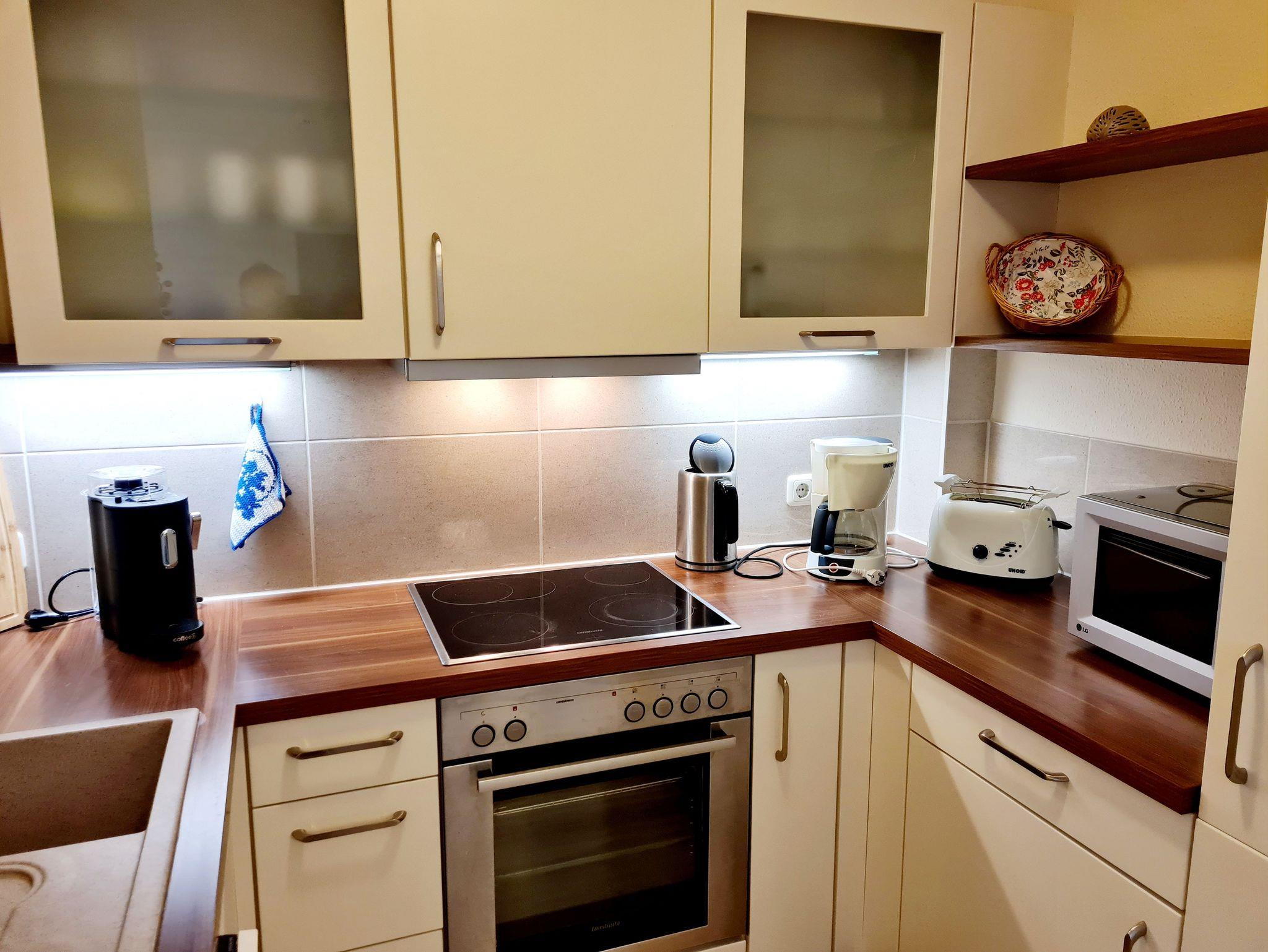 • Küche und Essbereich für 4 Personen offen zum Wohnzimmer mit Backofen, Ceranfeld, Geschirrspüler, Toaster, Kaffeemaschine, Wasserkocher, Kühlschrank mit Gefrierfach, Mikrowelle