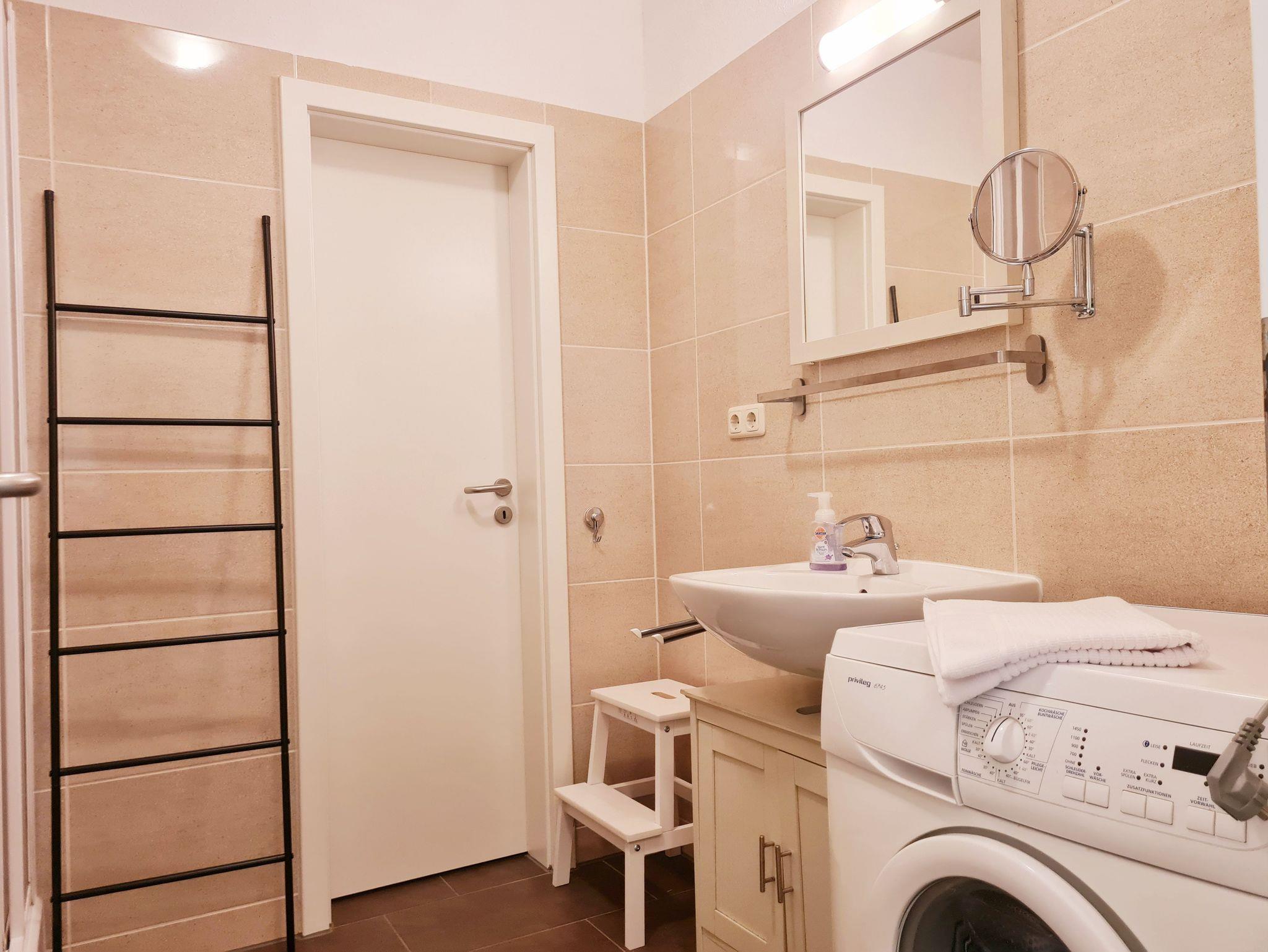 • Bad: ohne Fenster, Dusche, Waschbecken, Toilette, Spiegel, Unterschrank Waschbecken, Regal, Waschmaschine, Fön