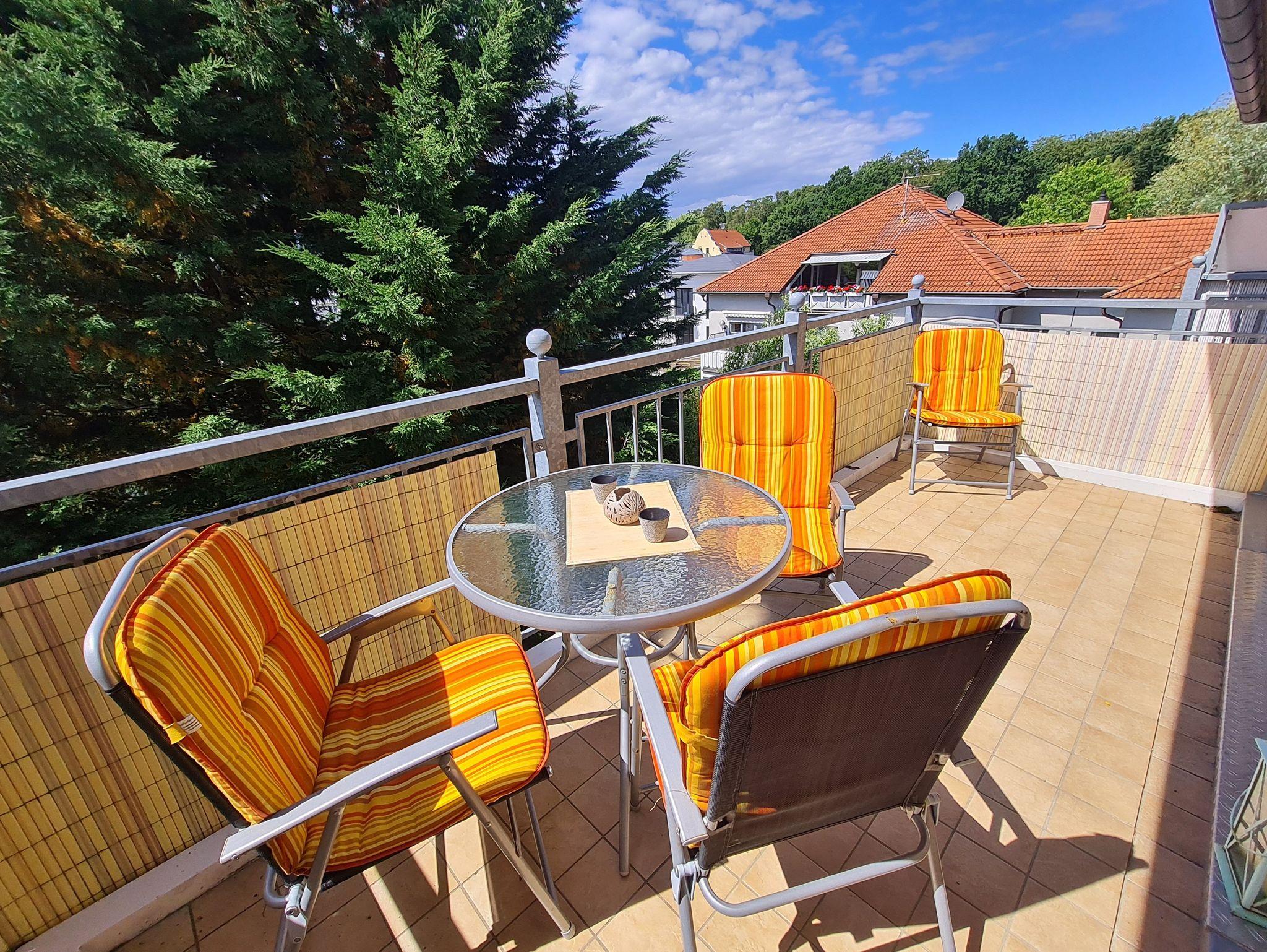 • Balkon: Westausrichtung, mit Tisch, Stühle für 4 Personen, Sonnenschirm, 2 Liegen