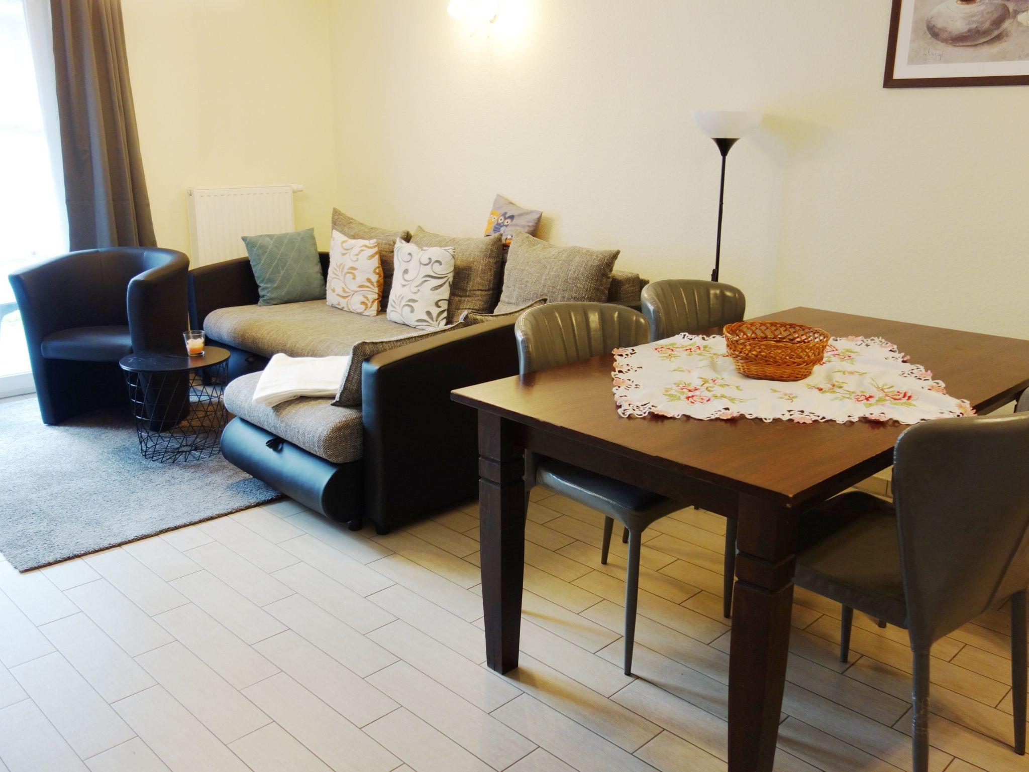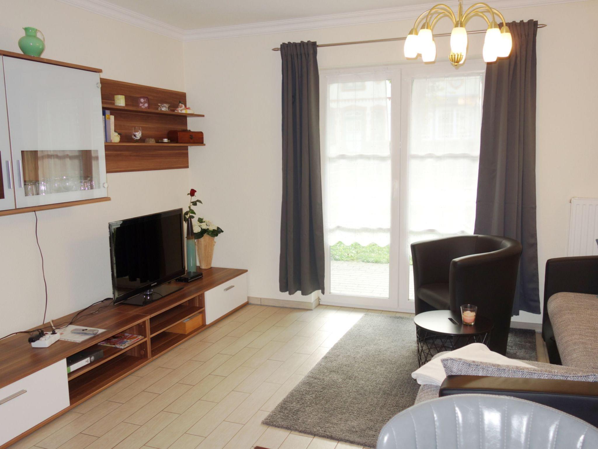 Ihre helle Ferienwohnung verfügt über ein Wohn- und ein Schlafzimmer. Im Wohnbereich befindet sich eine Schlafcouch sowie ein Fernseher und ein Einbauradio.