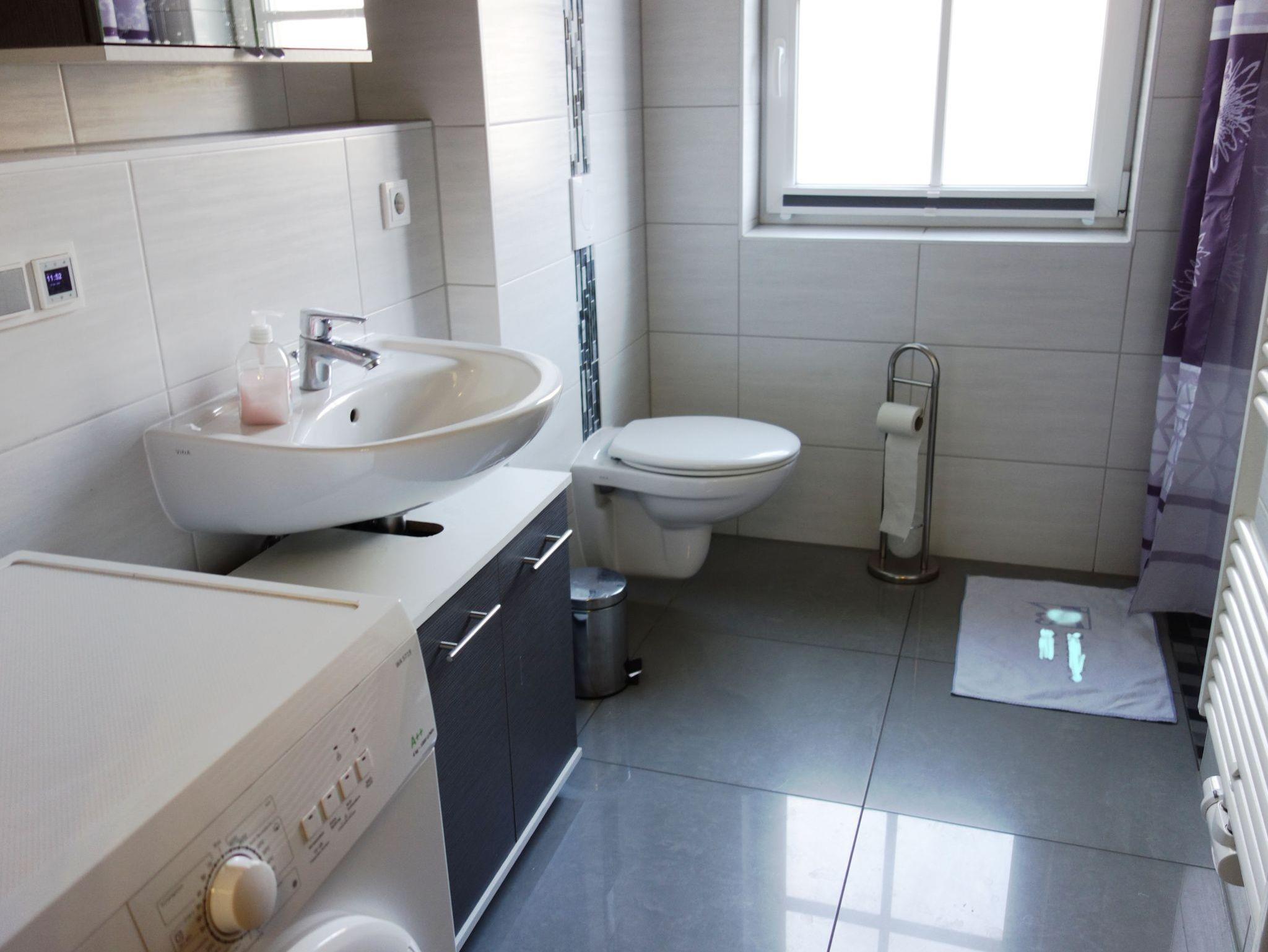 Das Bad mit Fenster hat eine bodengleiche Dusche mit Antirutschfliesen, ein WC, ein Einbauradio und eine Waschmaschine.