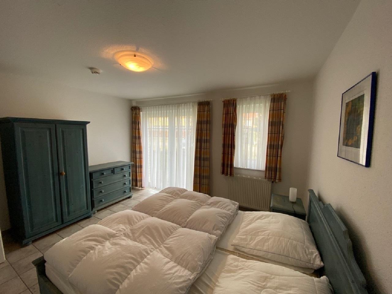 Im Schlafzimmer befindet sich ein Doppelbett (1,80m x 2,00 m), bodentiefe Fenster mit Außen Jalousie im Wohnzimmer und Schlafzimmer lassen viel Licht in die Wohnung.