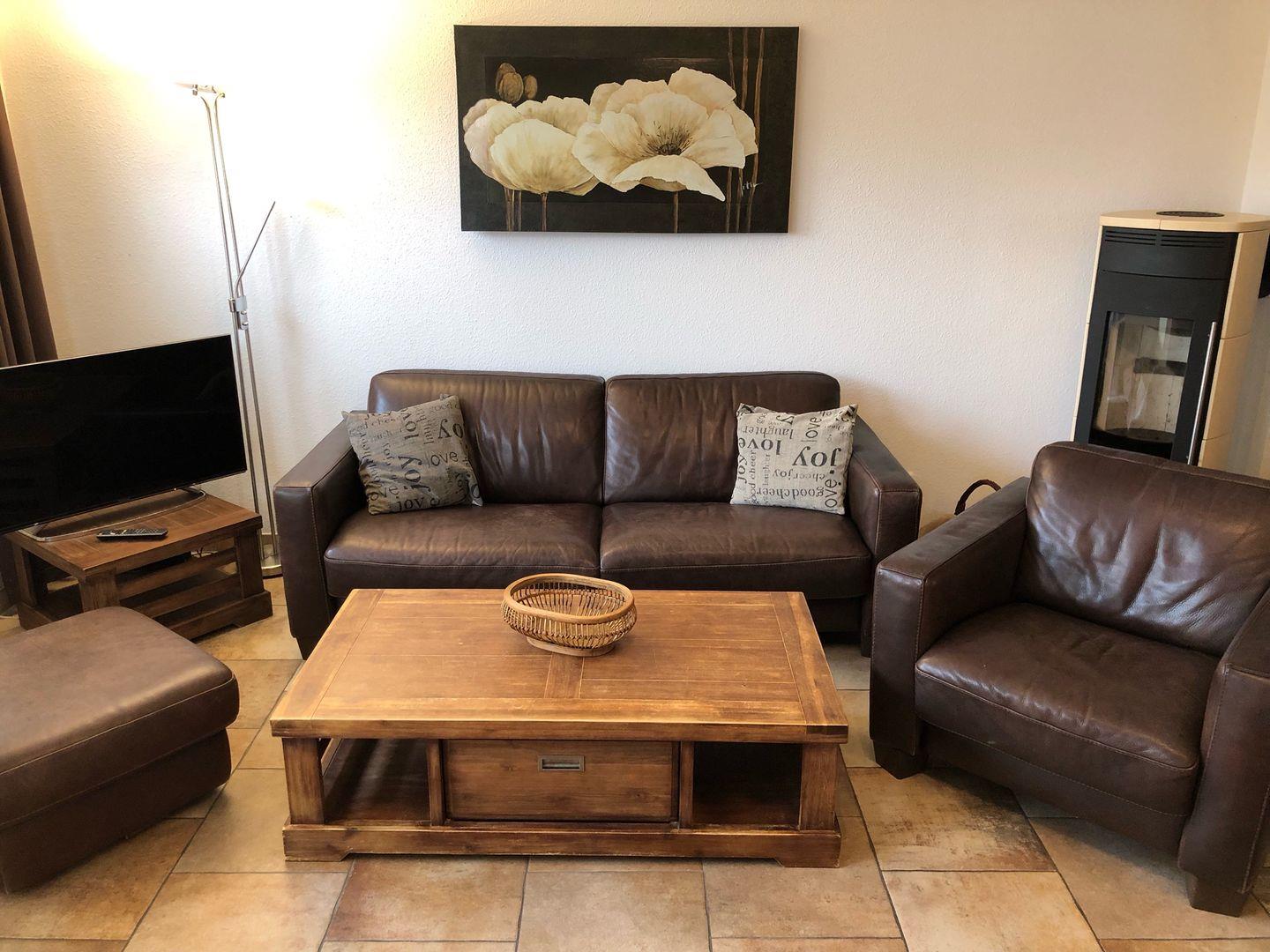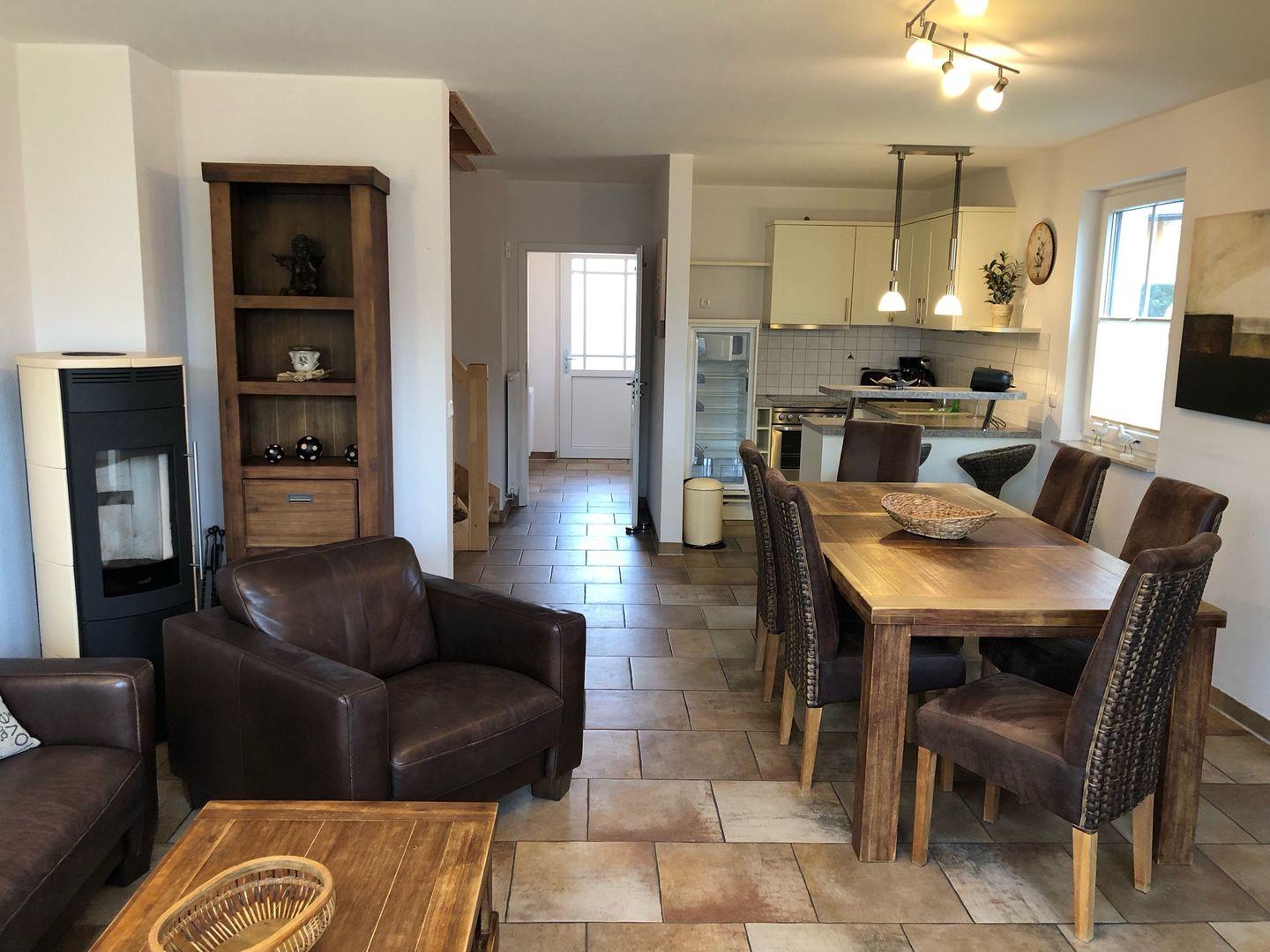 Der zur Küche offene Wohn-Essbereich ist mit TV und großem Esstisch ausgestattet. Ein behaglicher Kamin ergänzt das ruhige Ambiente.