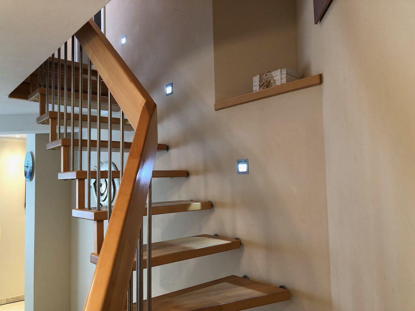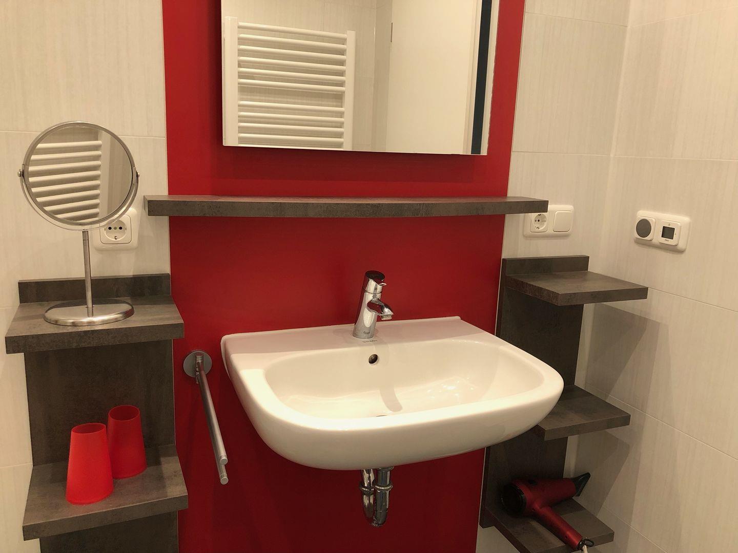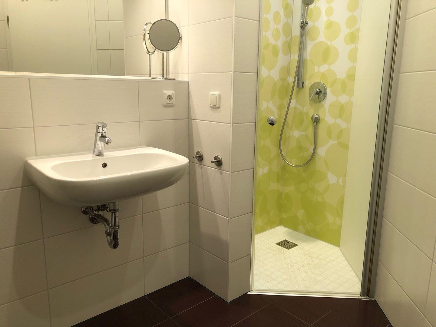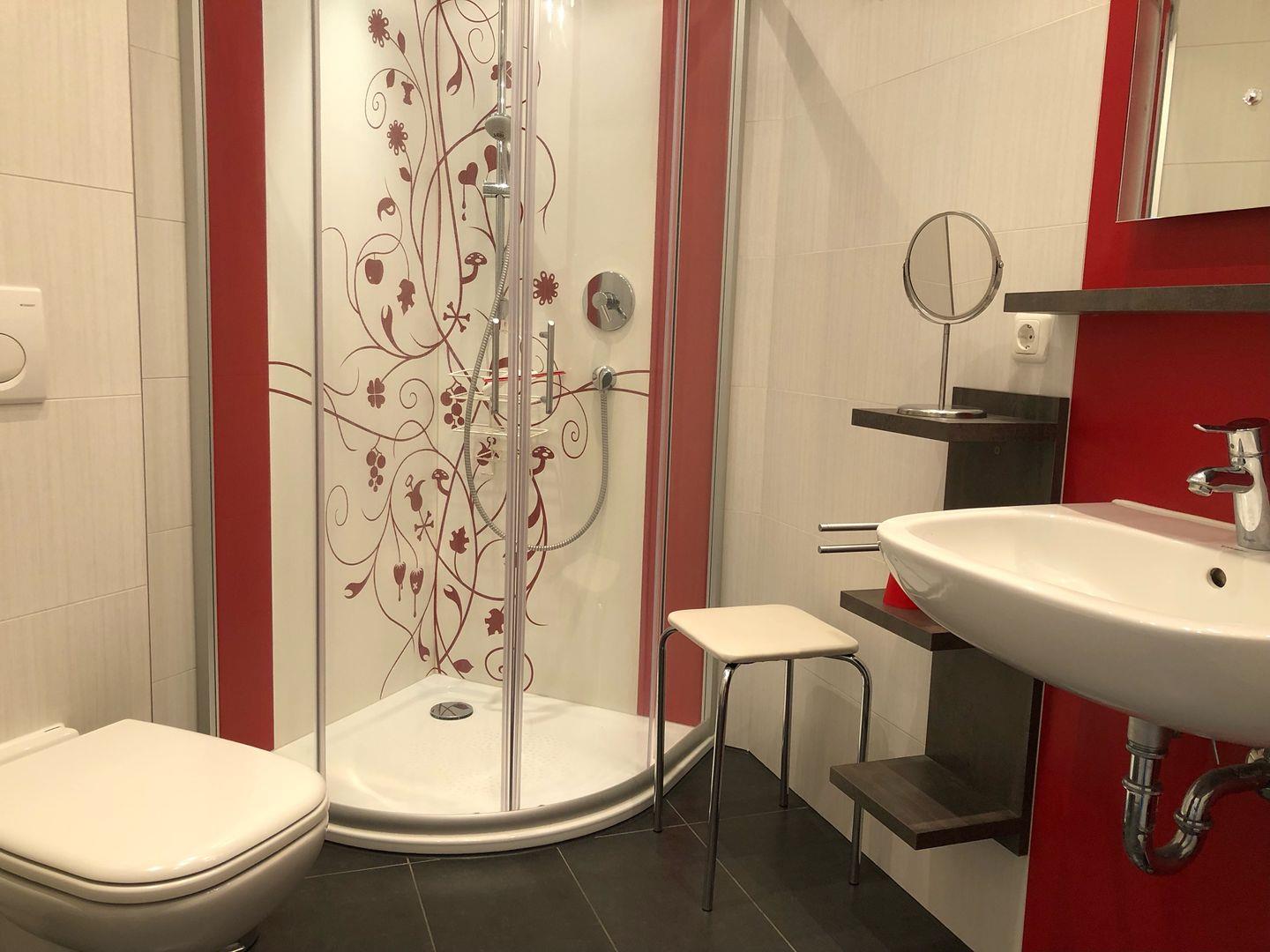 Über eine Treppe erreichen Sie das zweite Schlafzimmer und ein weiteres vollausgestattetes Bad mit ebenerdiger Dusche und WC.