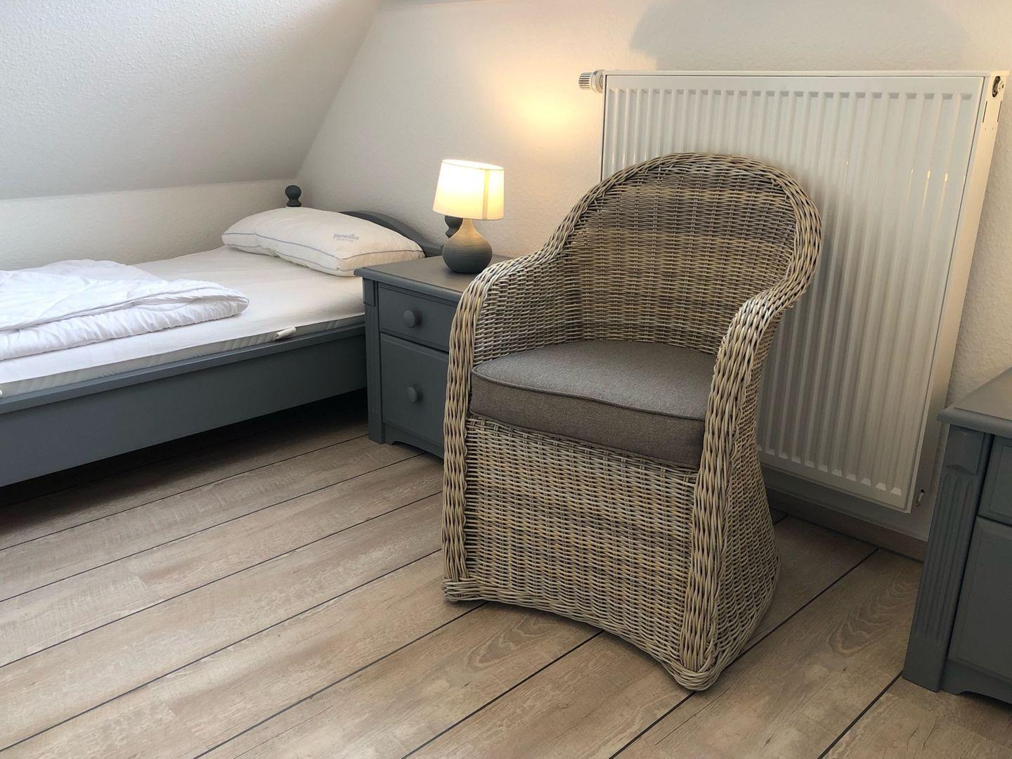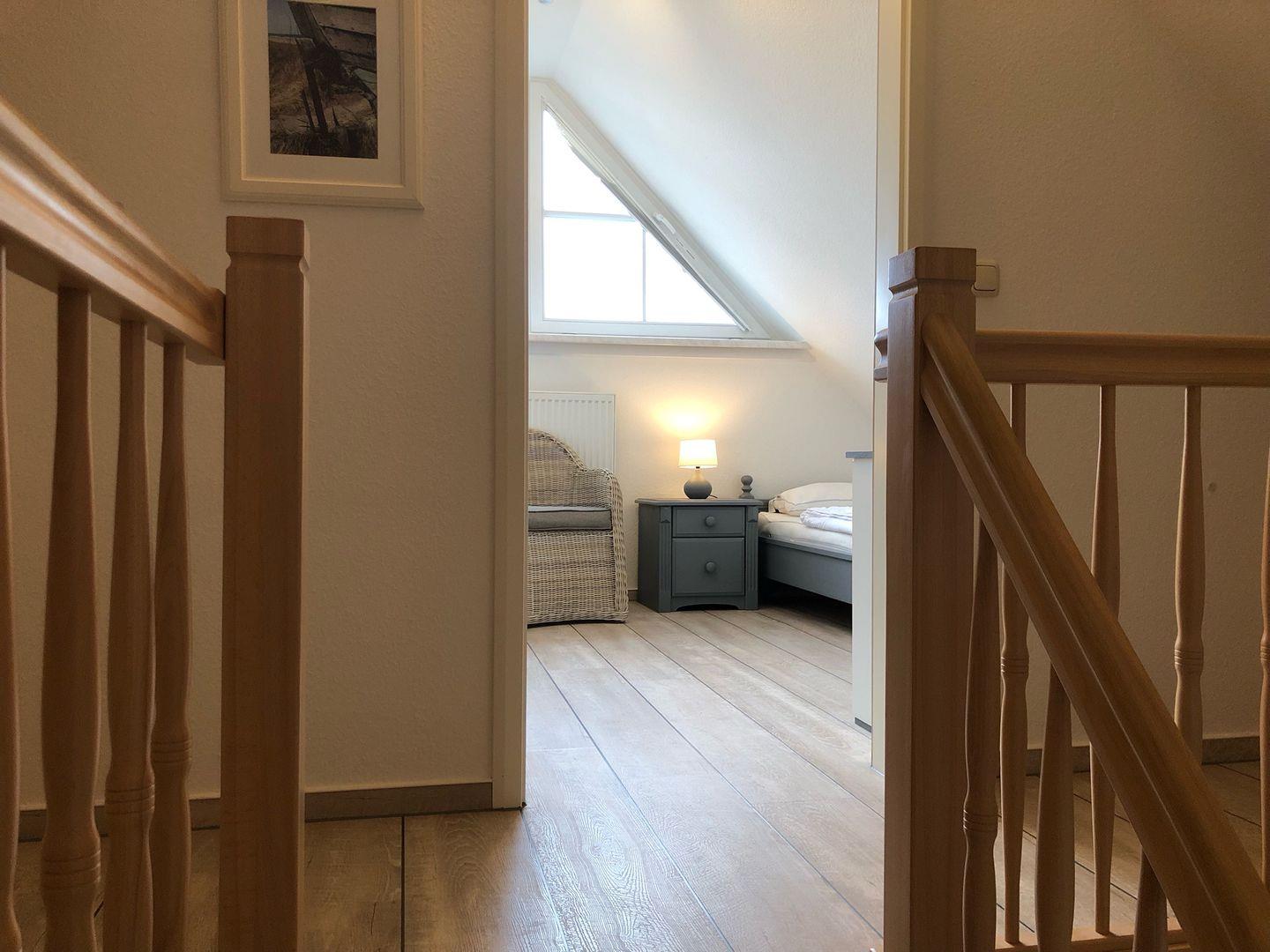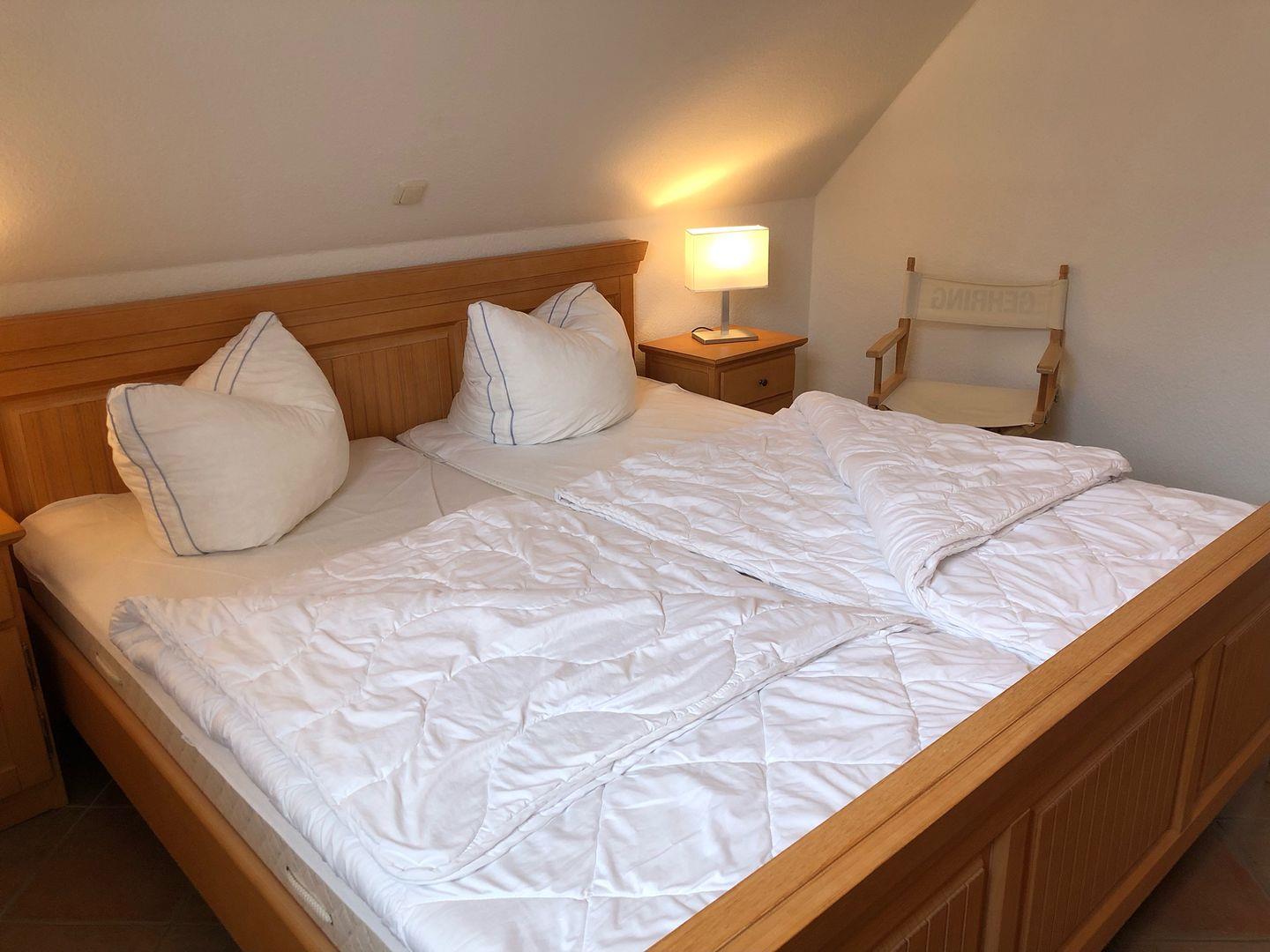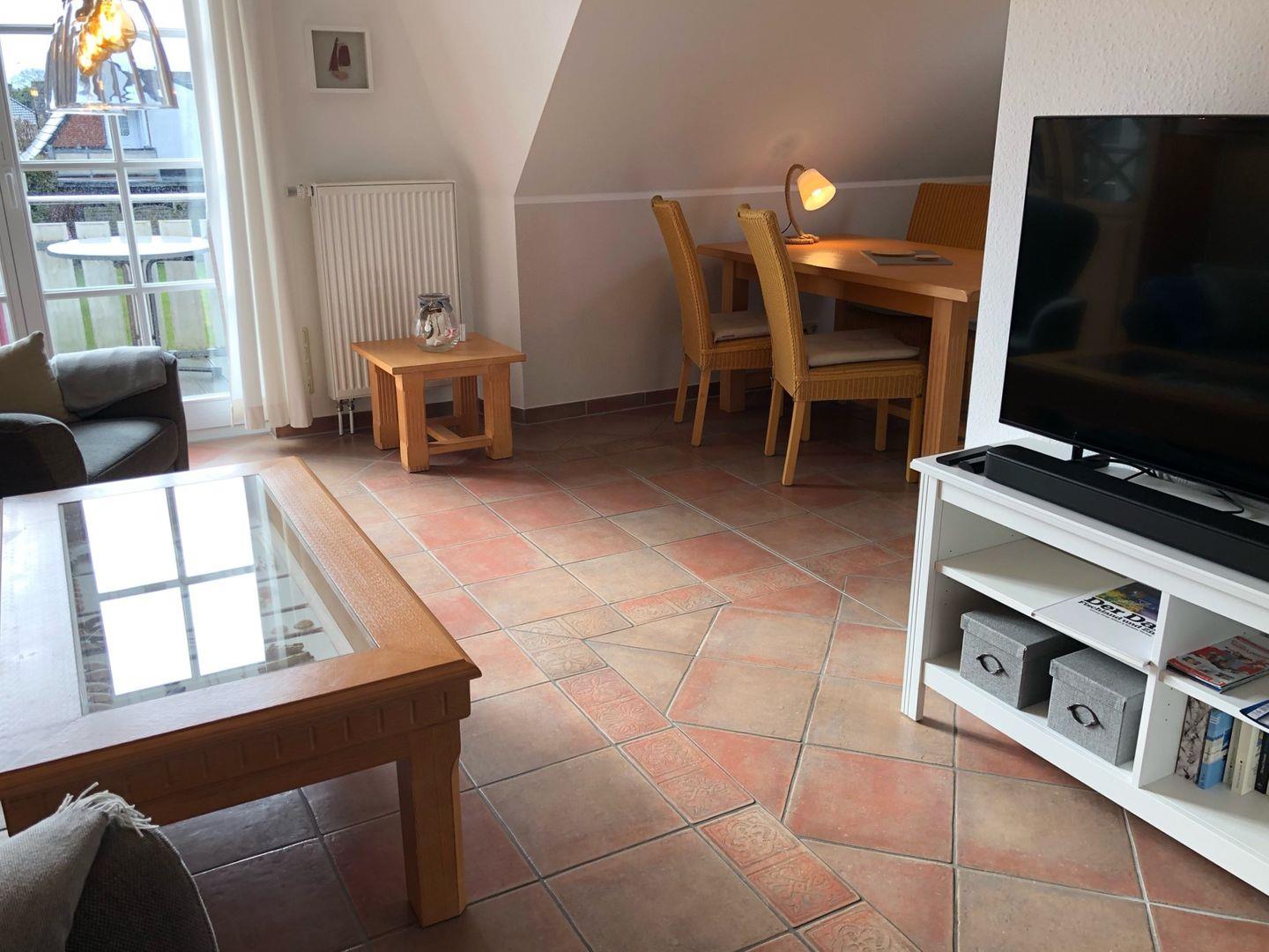 Ruhige Lage, nur wenige Minuten zum Strand und zur Seebrücke. Im Obergeschoß Wohnzimmer, Küche mit großem Essbereich, Schlafzimmer mit Doppelbett, Bad mit DU/WC, sonniger Süd-West-Balkon, Schlafzimmer mit 2 Einzelbetten im Dachgeschoß
