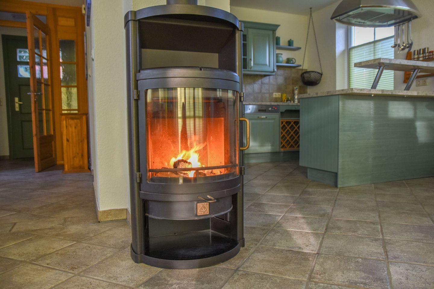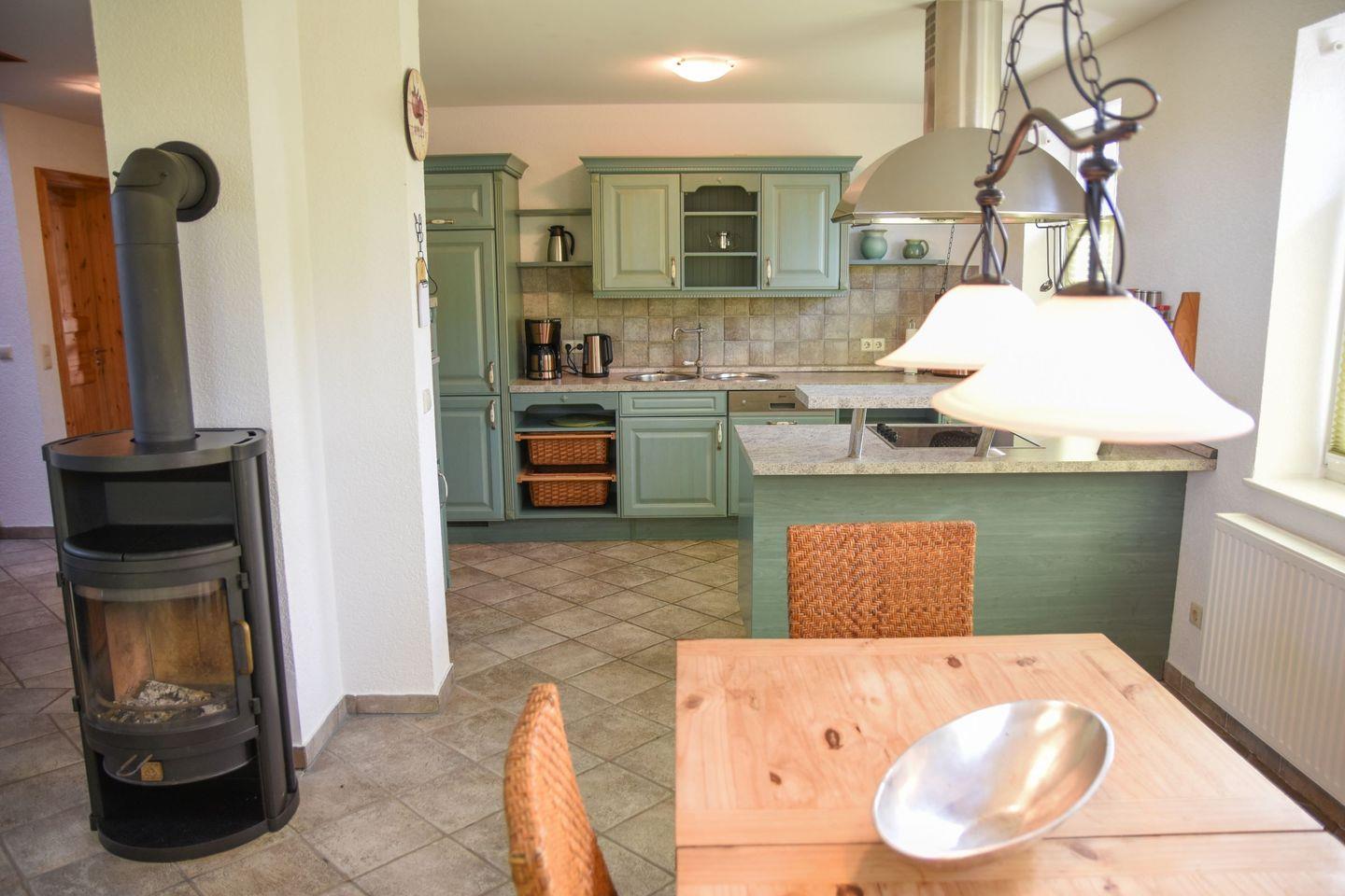 Im EG befindet sich die Küchenzeile, diese ist offen zum Wohn/Ess bereich und mit Kaminofen. Auch ein Gäste- WC ist im EG.