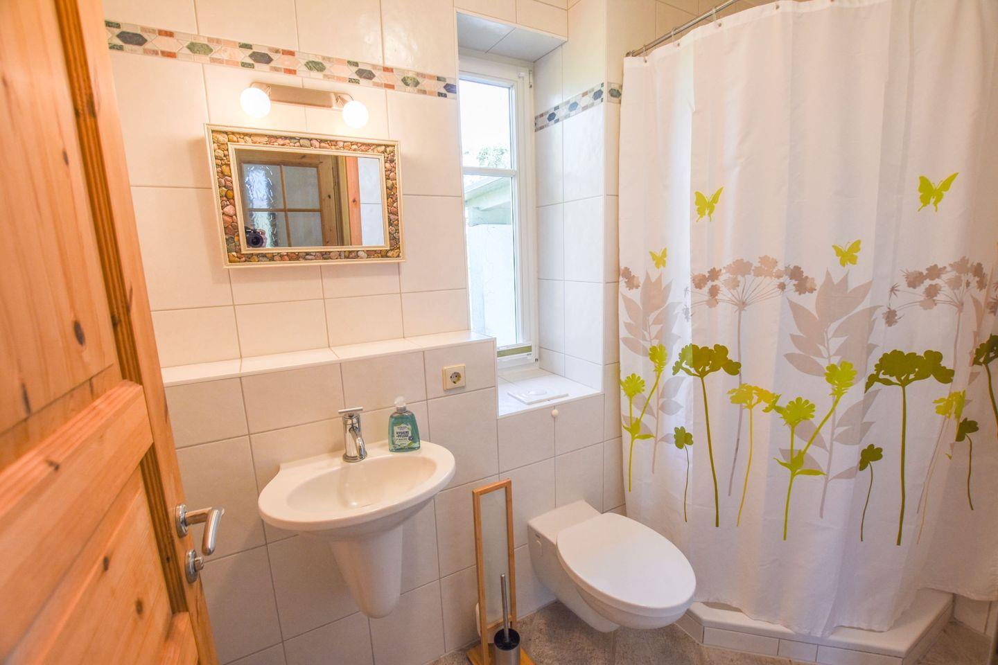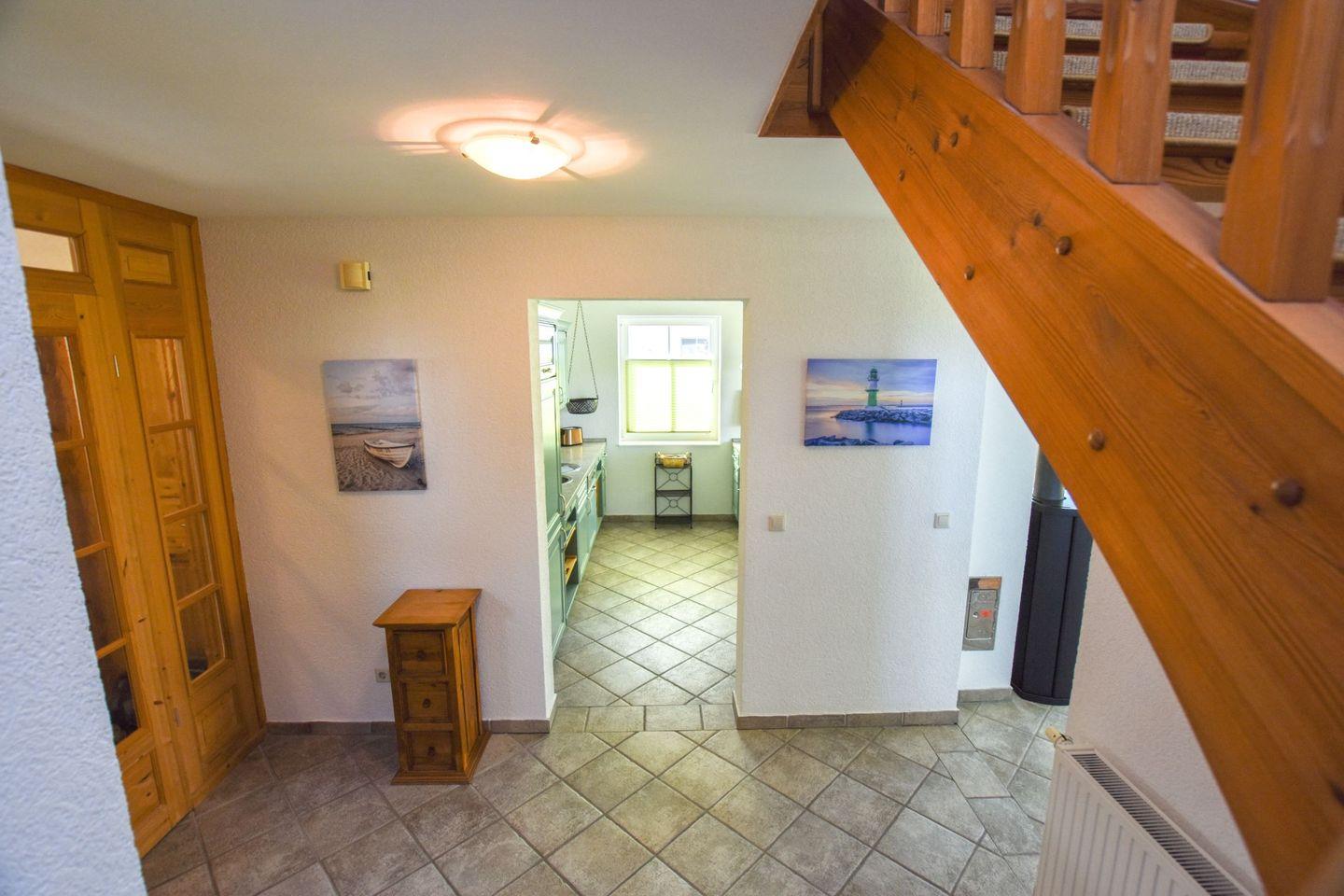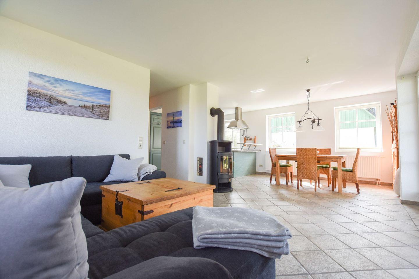 Ferienhaus , ca. 104 qm, Strandentfernung ca.2 Km, das Haus befindet sich im OT Müggenburg nähe Bodden, Wohnzimmer mit kompl. Küchenzeile mit Microwelle, Kaminofen, 2 Schlafzimmer mit Boxspringbetten + TV a 1,80 x 2,00 m, 2 Bäder, Dusche /WC, Badewanne / WC / Bidet, 2 PKW-Stellplätze, Carport, Terrasse und Garten, Waschmaschine, Wickelkommode, Treppenschutzgitter, Hochstuhl u. Kinderbett inkl.