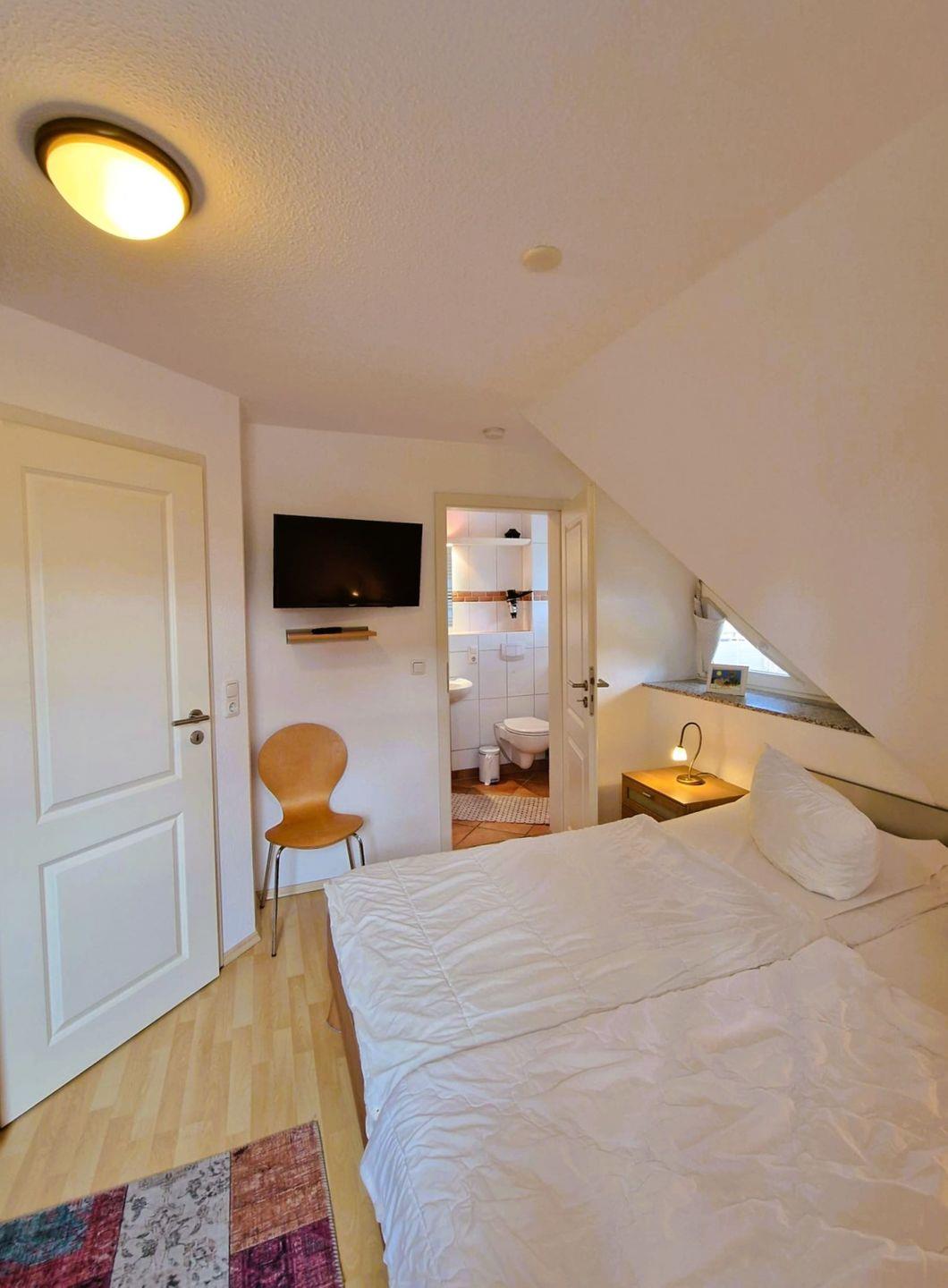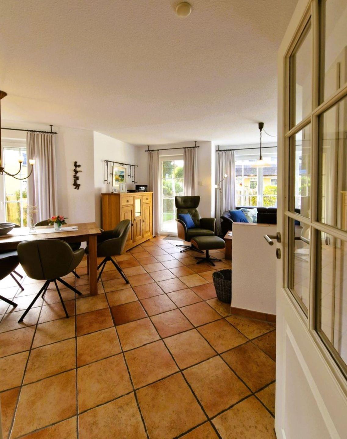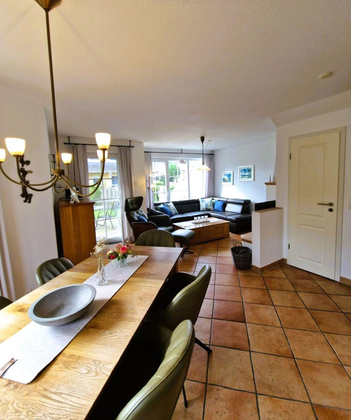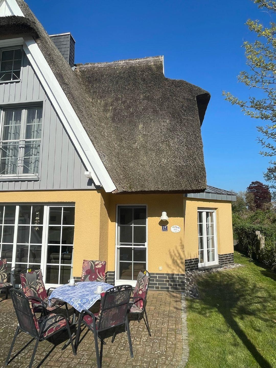 Die sehr schöne, ruhig gelegene mit Schilf gedeckte Doppelhaushälfte am Ende einer Sackgasse in einem Ensemble von mehreren Häusern dieser Art im Mine-Heimat-Weg wurde 2007 erbaut und ist sehr gut eingerichtet. W-Lan inkl. 3 Schlafzimmer, 2 Bäder und 1 Gäste-WC bieten mindestens 5 Personen genug Platz.