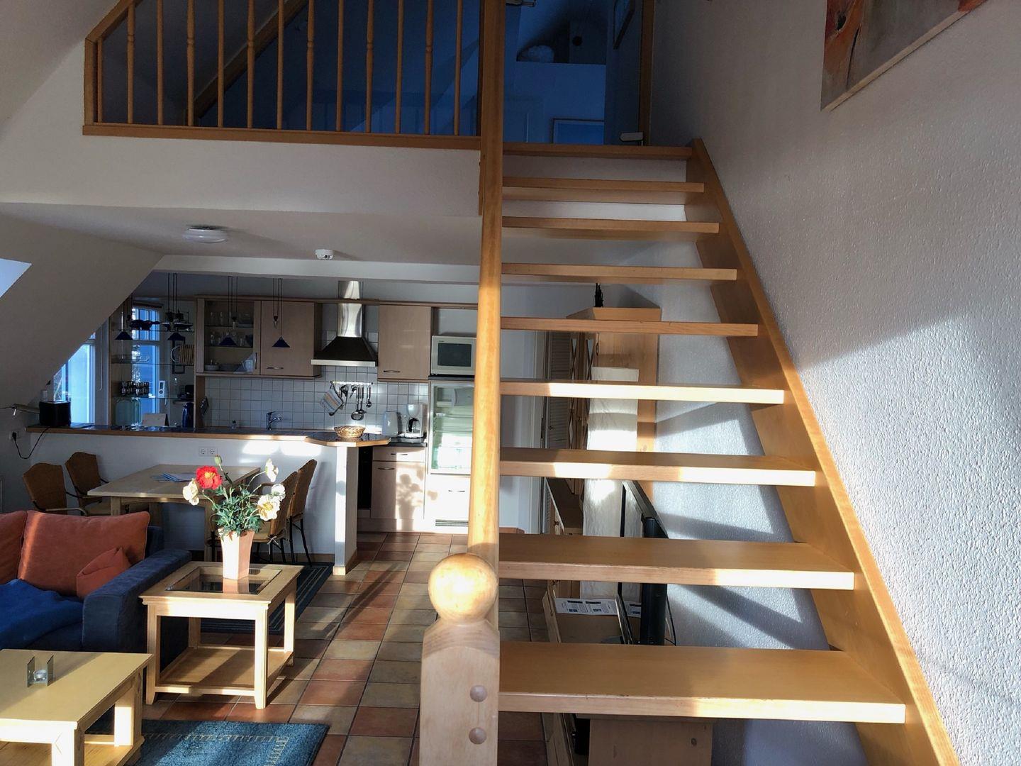 Appartementhaus direkt am Zingster Hafen, ca. 90 m² Maisonetten Wohnung im mediterranen Stil, Strand ca. 900 m, Wohnung im 2.Stock, komplett eingerichtete Küchenzeile mit Theke, Schlafzimmer mit Ehebett, Dusche/WC, 1 großer Südbalkon mit freien Boddenblick, 1 Westbalkon, Obergeschoß: separater Wohn/Schlafraum mit Sat-TV, 1 Ostbalkon zum Innenhof, Dusche/WC, 1 PKW-Stellplatz Nr. 26 (Tiefgarage),