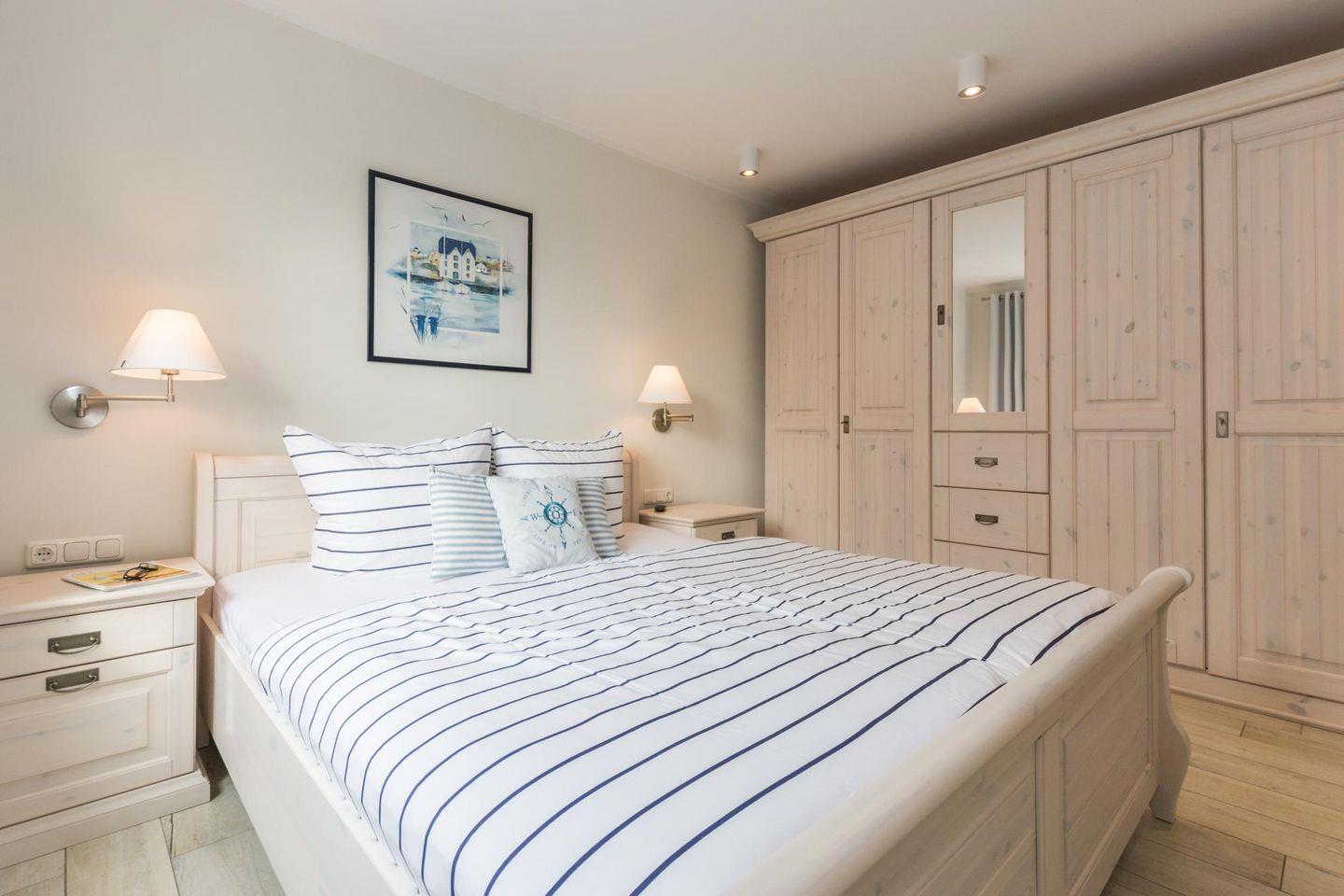 Im Schlafzimmer befindet sich ein Doppelbett (1,80 x 2,00 m), ein großer Kleiderschrank mit einem Safe und ein LED-TV.