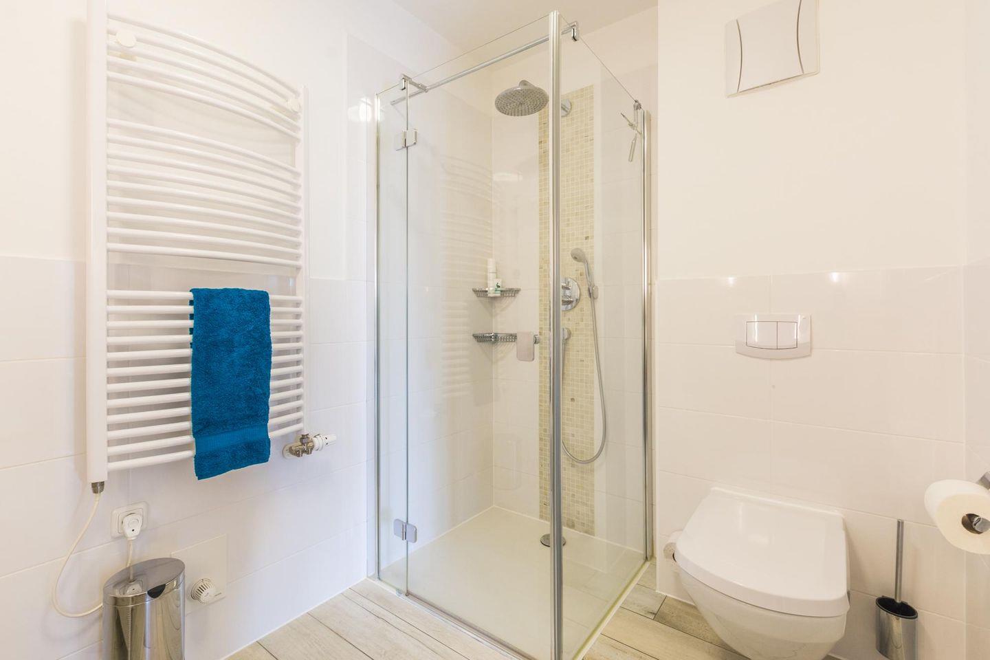 Das Bad verfügt über eine hochwertige Sanitärausstattung und eine bodengleiche Dusche. Fußbodenheizung, Handtuchtrockner, Haartrockner und Kosmetikspiegel sind vorhanden.