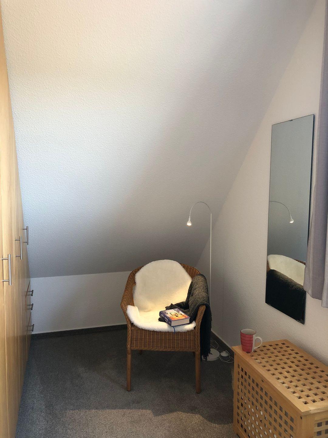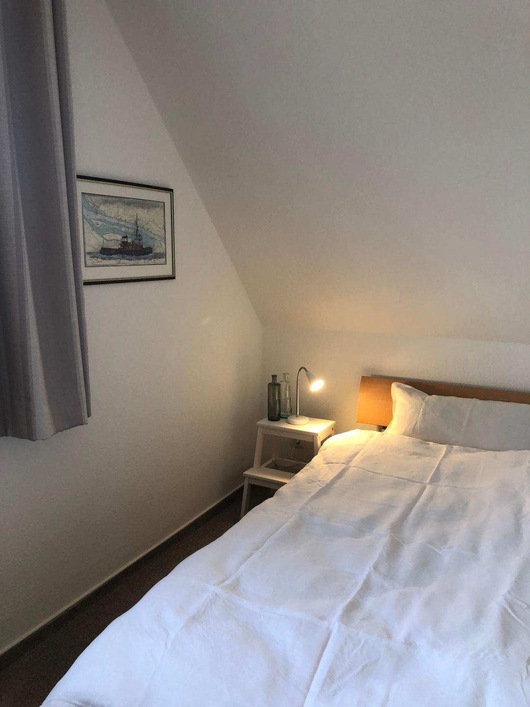 Im Schlafzimmer gibt es ein Ehebett (2,00m x 2,00m) und Verdunklungsgardinen