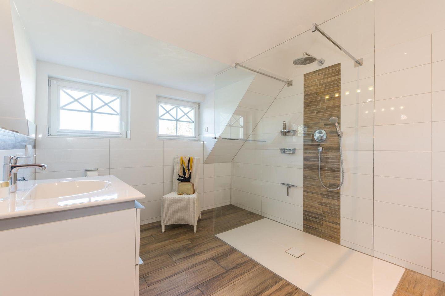 Das Bad verfügt über ein Fenster, eine hochwertige Sanitärausstattung sowie eine bodengleiche und begehbare Dusche. Fußbodenheizung, Handtuchtrockner, Haartrockner und Kosmetikspiegel sind vorhanden.