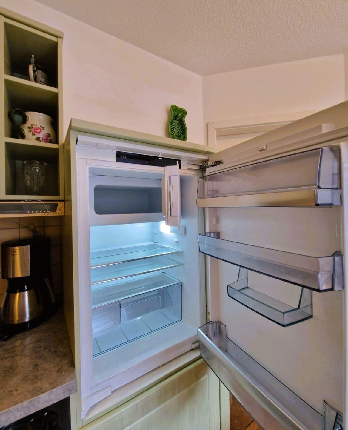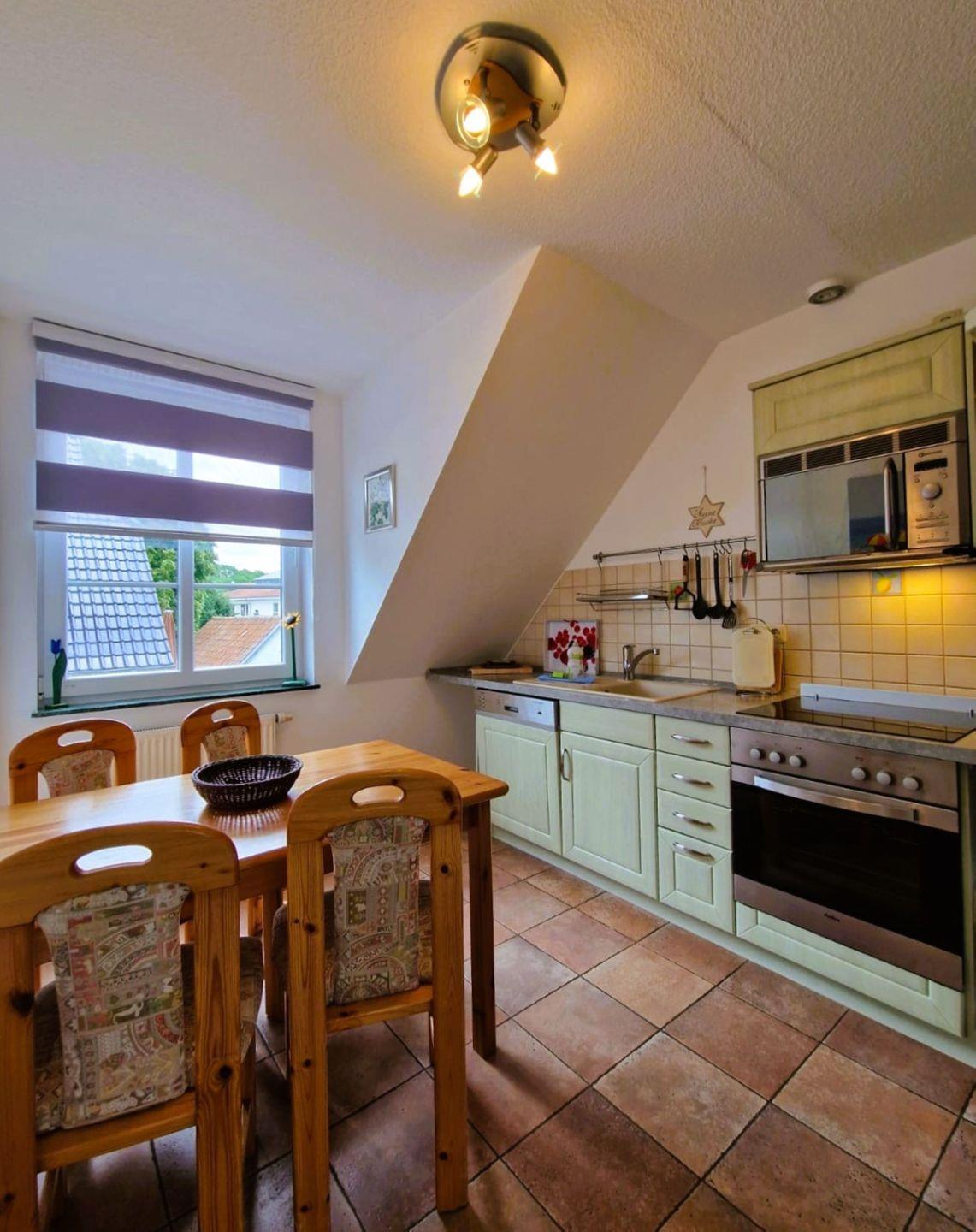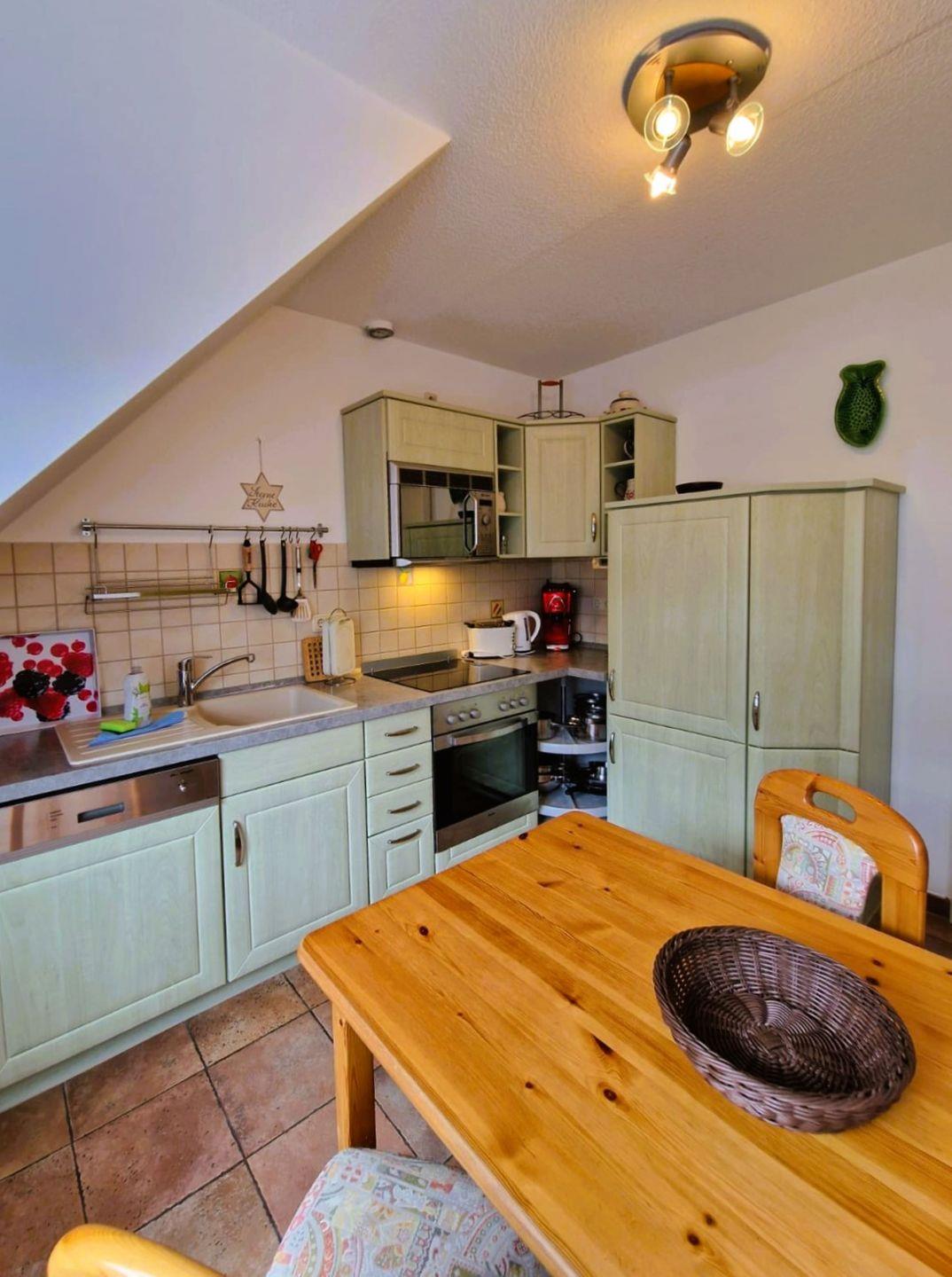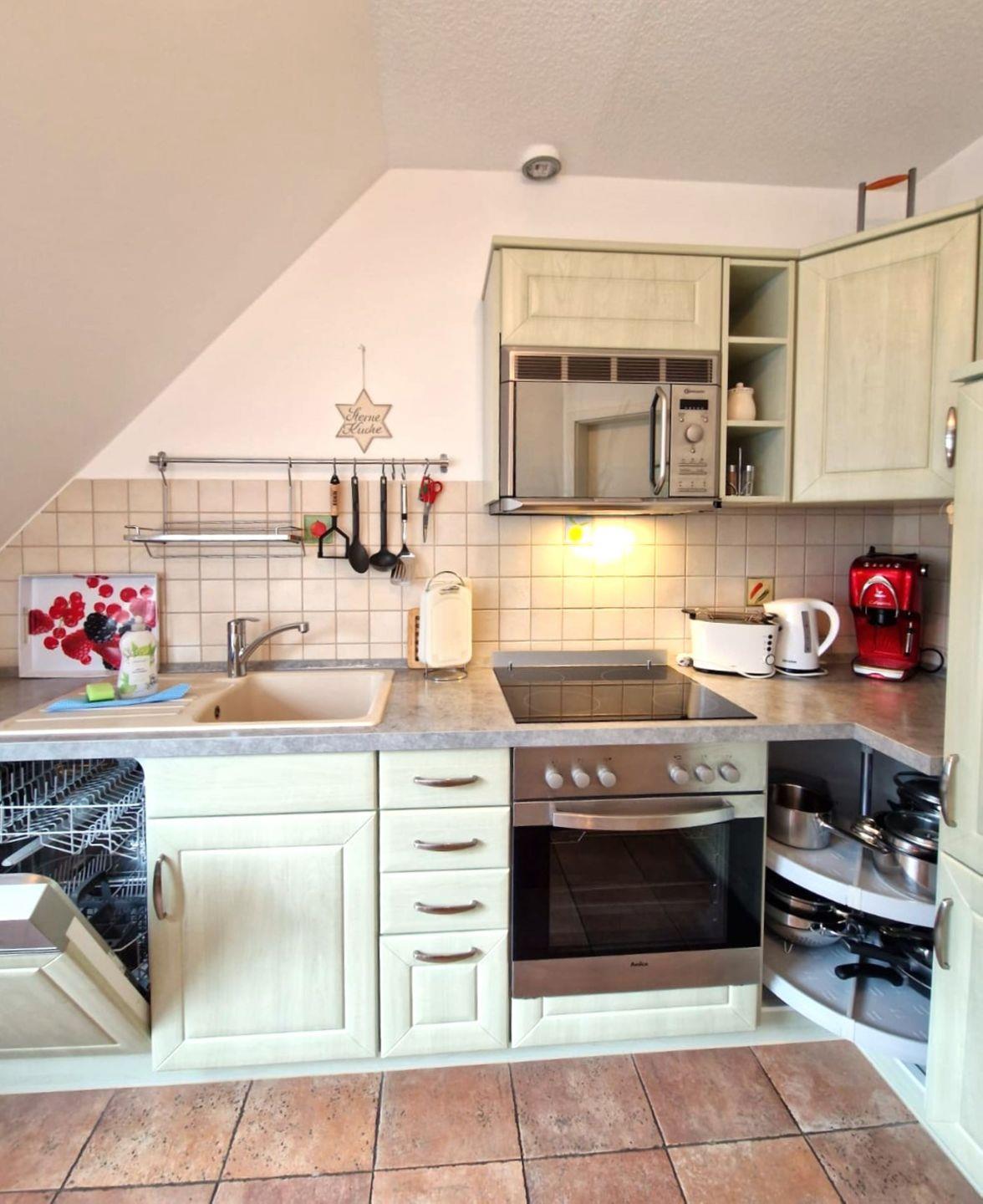 Die offene Küche, die direkt in das helle Wohnzimmer übergeht, bietet alle Annehmlichkeiten, die Sie zur Selbstversorgung benötigen. Ausgestattet mit Cerankochfeld, Backofen, Mikrowelle, Spülmaschine und Kühlschrank, steht einem schmackhaften Frühstück oder einem gemütlichen Abendessen nichts im Weg. Für zusätzlichen Komfort sorgt eine kleine Auswahl an Küchenhelfern, darunter Wasserkocher, Toaster und eine Kaffeemaschine.