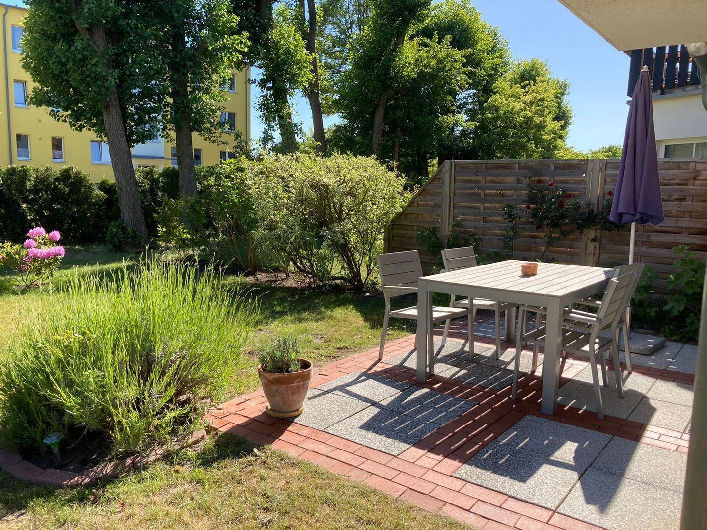 Die große Terrasse ist mit Gartenmöbeln ausgestattet und bietet den perfekten Ort, um die frische Ostseeluft zu genießen oder ein gemütliches Frühstück im Freien zu verbringen.