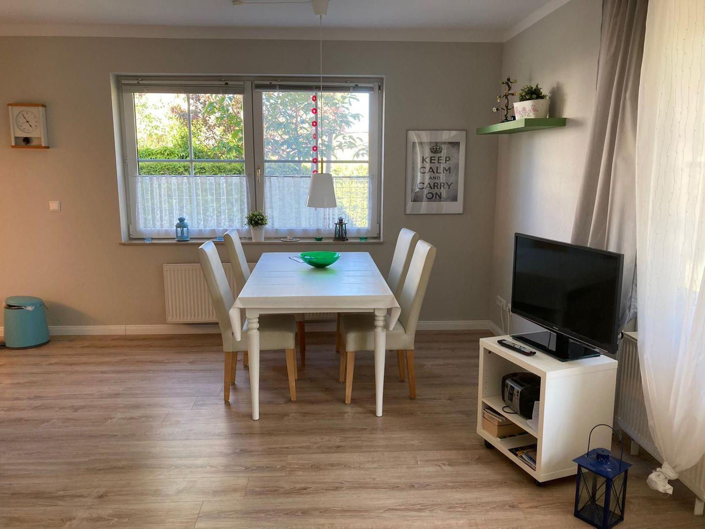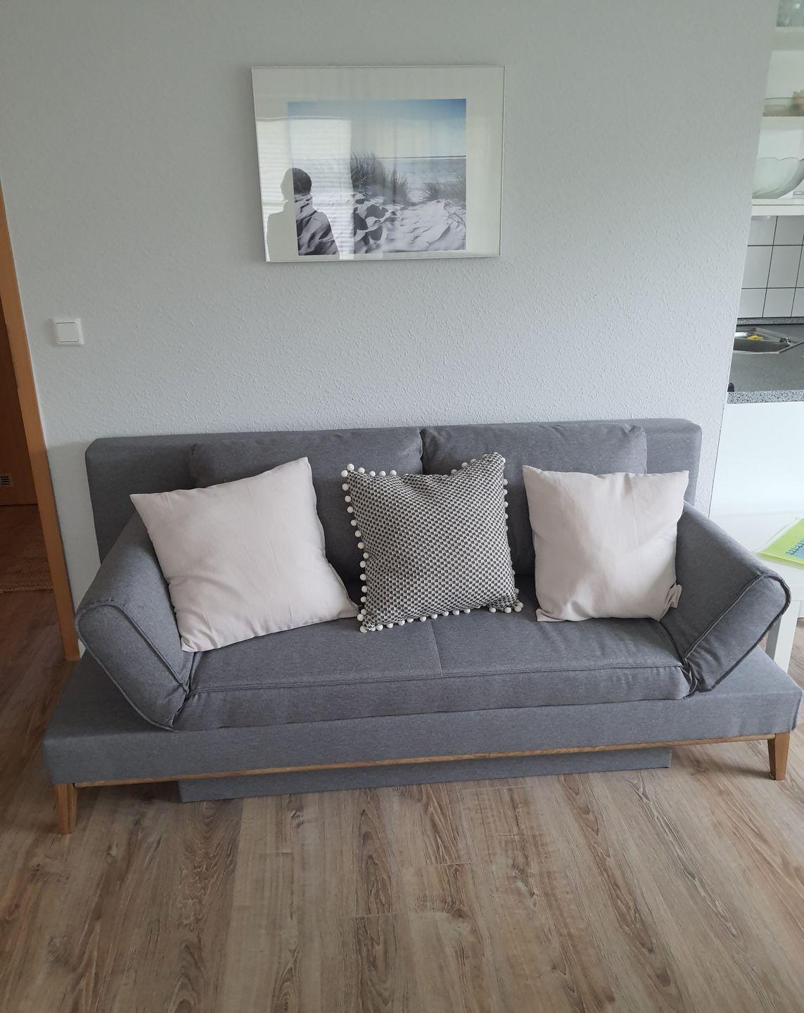 Das Wohnzimmer ist mit einer Schlafcouch für die 3. Person eingerichtet. Entspannen Sie nach einem aktiven Tag am Strand und genießen Sie Ihren Lieblingsfilm auf dem Fernseher. Das WLAN in der Wohnung sorgt dafür, dass Sie auch während Ihres Urlaubs immer in Verbindung bleiben können.