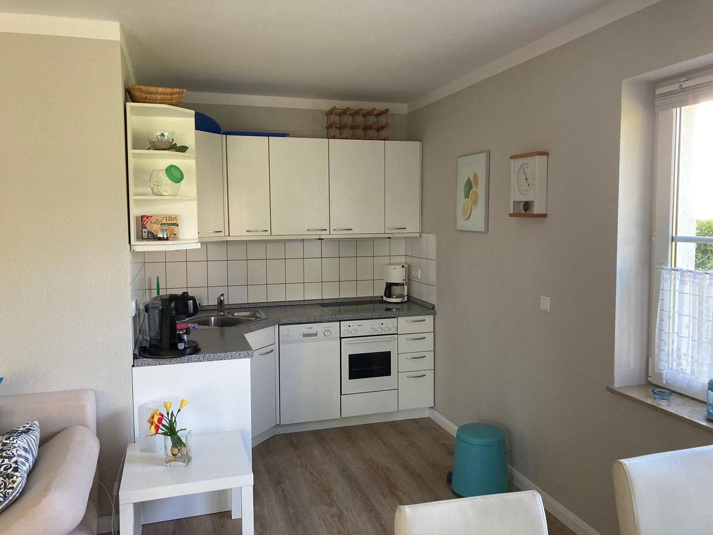 Die Wohnung verfügt über ein gemütliches Schlafzimmer mit einem Doppelbett. Eine offene Küche im Wohnzimmerbereich ist modern und vollständig ausgestattet mit einem Herd, Backofen, Kühlschrank, Spülmaschine und sämtlichen Geschirr- und Besteckutensilien, sodass Sie hier kulinarische Köstlichkeiten zubereiten können. Genießen Sie eine Tasse frisch gebrühten Kaffee aus der Kaffeemaschine oder der Espressomaschine und lassen Sie den Tag entspannt beginnen.
