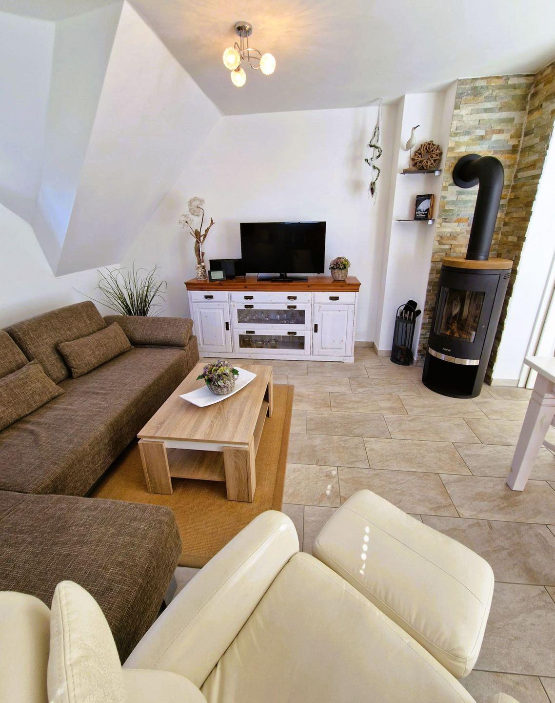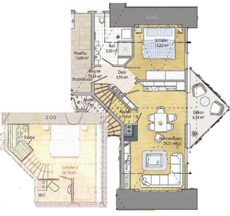 Die 74m² große Maisonettewohnung für 4 Personen liegt in einem 5- Familienhauses. Die Wohnung verfügt über ein Wohnzimmer mit integriertem Küchenbereich, Kamin, Sat-TV mit Pay-TV CI-kartenadapter, Fußbodenheizung, Radio, zwei Schlafzimmer mit TV, Bad mit Dusche/WC, Gäste-WC und Sauna inkl. im OG.