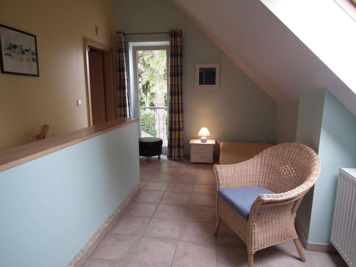 Im Erdgeschoss befindet sich das Wohnzimmer mit gemütlichem Essbereich und einer komplett ausgestatteten Einbauküche. Durch eine große Glasschiebetür gelangen Sie auf die Südterrasse. Vom Flur geht das Tageslichtbad mit Dusche und WC ab. Eine Raumspartreppe mit breiten Stufen und beidseitigem Geländer führt in den 1. Stock, wo sich ein Elternschlafzimmer mit Doppelbett und Kleiderschrank und die zum Flur hin offene Galerie mit 2 Einzelbetten und Kleiderschrank befinden.