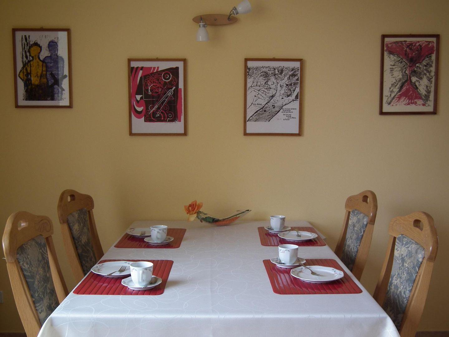 Im Erdgeschoss befindet sich das Wohnzimmer mit gemütlichem Essbereich und einer komplett ausgestatteten Einbauküche.