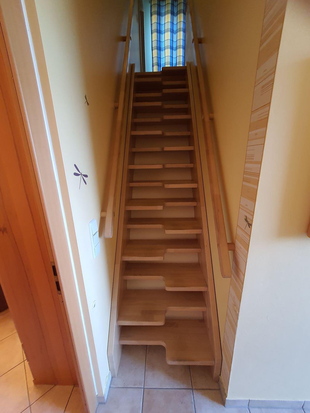 Eine Raumspartreppe (Wechselstufentreppe) mit breiten Stufen und beidseitigem Geländer (Kindersicherung vorhanden) führt in den 1. Stock, wo sich ein sehr geräumiges Elternschlafzimmer mit Doppelbett und großem Kleiderschrank und die zum Flur hin offene Galerie mit 2 Einzelbetten und eigenem Kleiderschrank befinden.