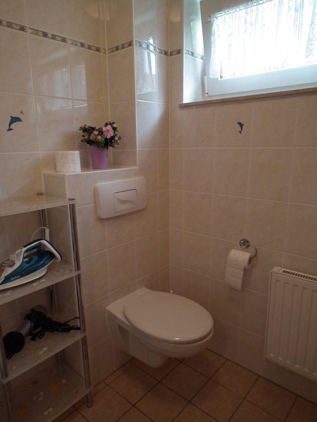 Der angrenzende Garten kann mitgenutzt werden. Vom Flur geht das Tageslichtbad mit Dusche und WC ab.