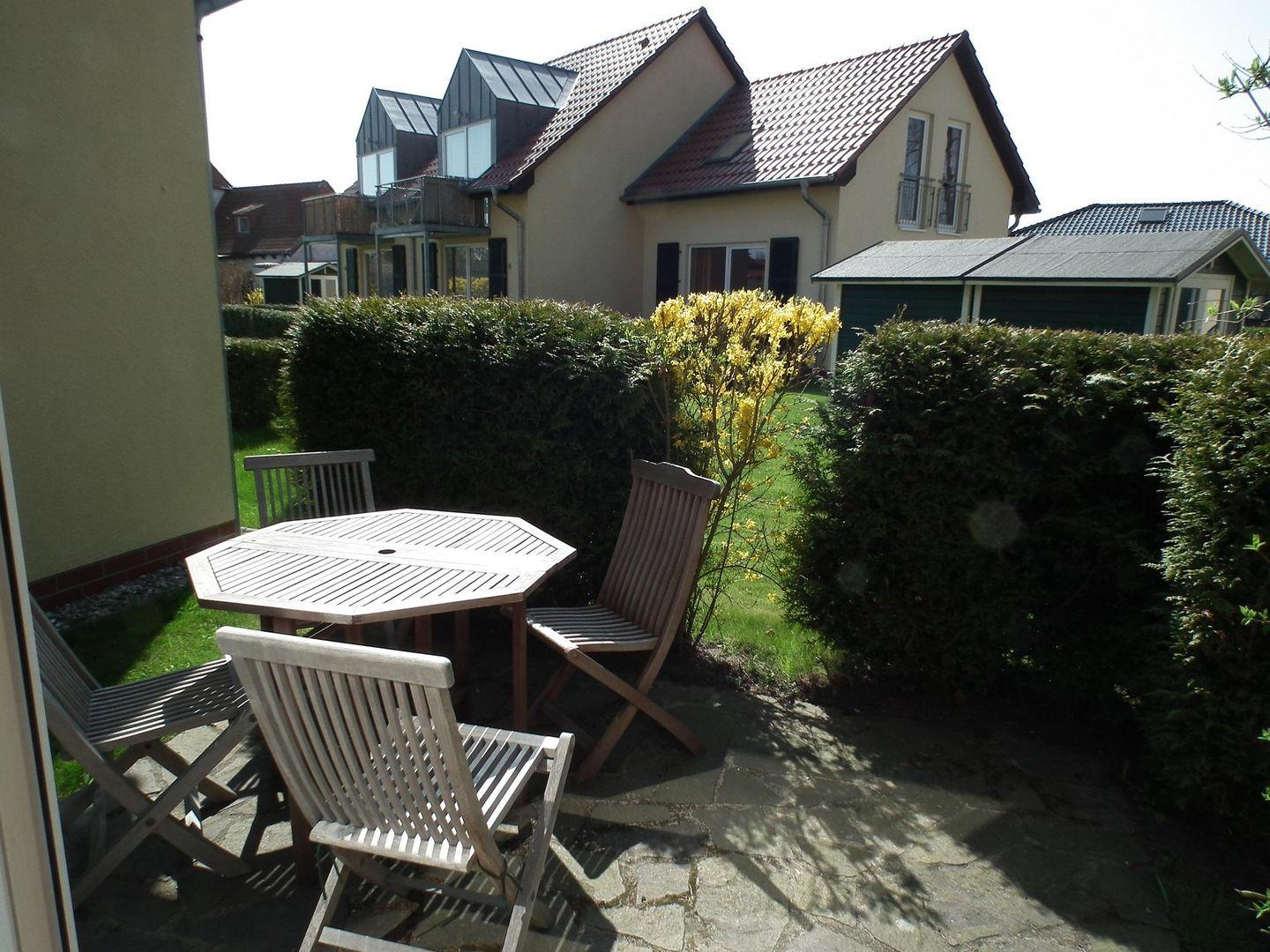 Durch eine große Glasschiebetür gelangen Sie auf die Südterrasse (blickdicht bepflanzt), die zu einem gemütlichen Frühstück ebenso einlädt wie zu einem entspannten Abend nach einem sonnigen Strandtag.