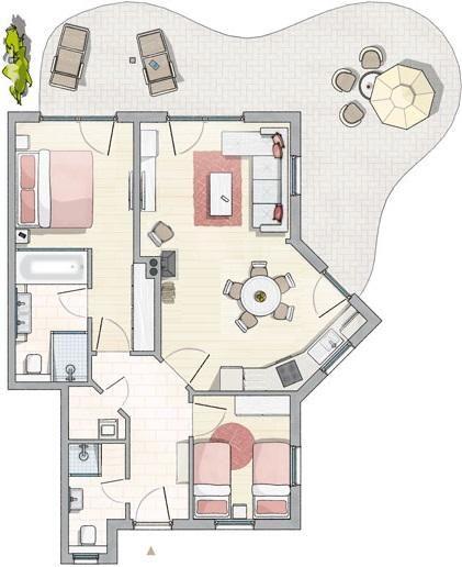 Die Wohnung verfügt über ein Wohnzimmer mit integriertem Küchenbereich, Esstisch und Kamin, großzügiger Sitzecke, ein großes Schlafzimmer mit Doppelbett, eigenem Terrassenzugang und Sat-TV sowie großem Einbauschrank, ein Gäste- / Kinderzimmer mit 2 Einzelbetten, Bad mit Dusche, Badewanne, Handtuchheizkörper, Lautsprecheranlage und großem Fenster zum Schlafzimmer, ein separates Bad mit Dusche, einen Abstellraum mit Waschmaschine sowie eine schöne Terrasse und Rasenfläche