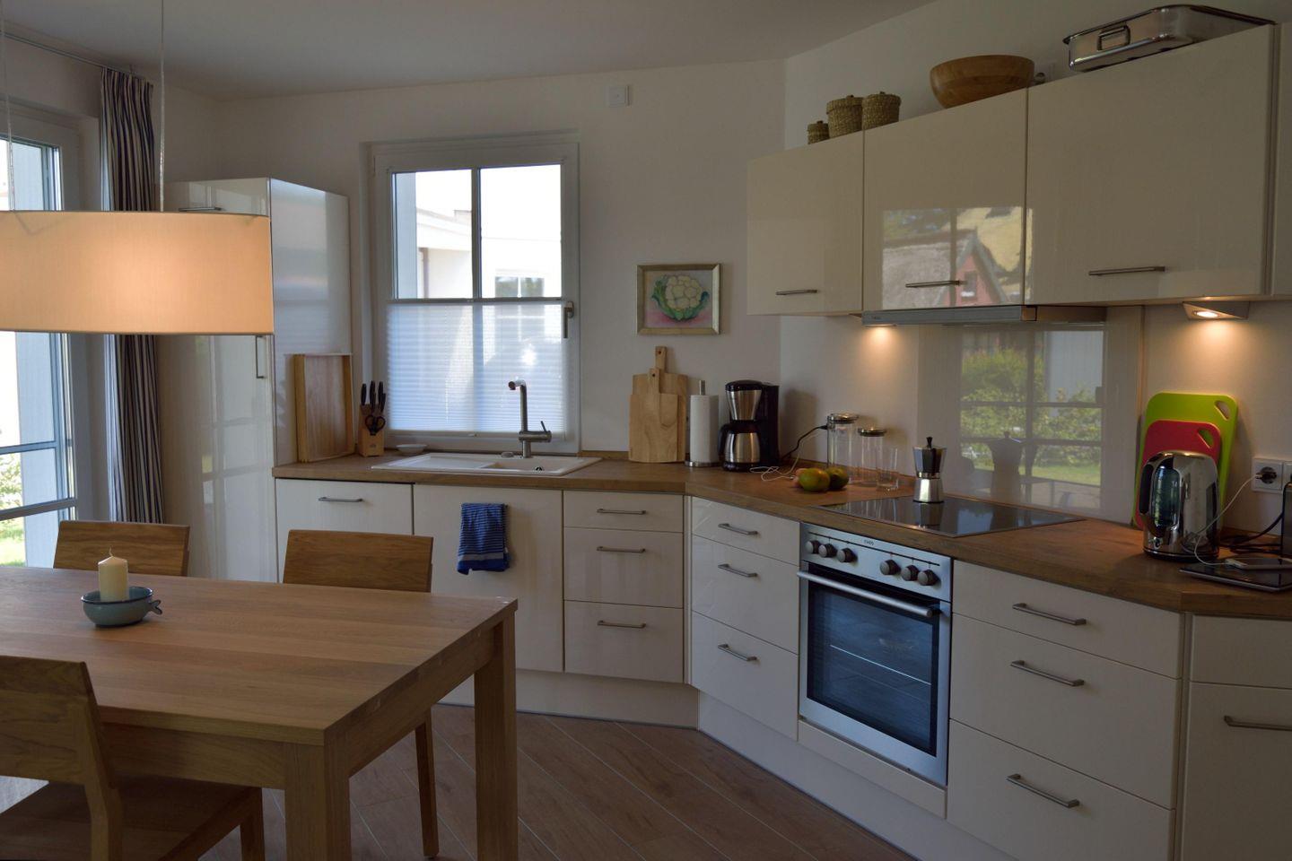 Die Küche ist voll ausgestattet mit Cerankochfeld, Backofen, Mikrowelle, Geschirrspüler und Kühlschrank mit Gefrierfach.