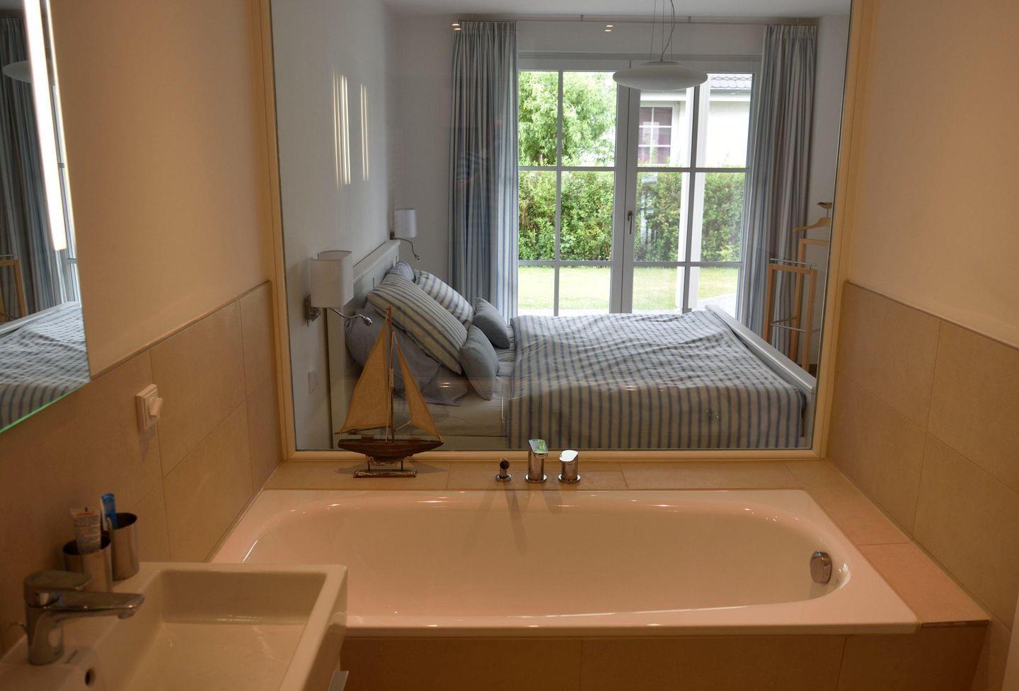 Das moderne Badezimmer verfügt über Badewanne und Dusche/WC, Handtuchheizkörper, Lautsprecheranlage und großem Fenster zum Schlafzimmer.