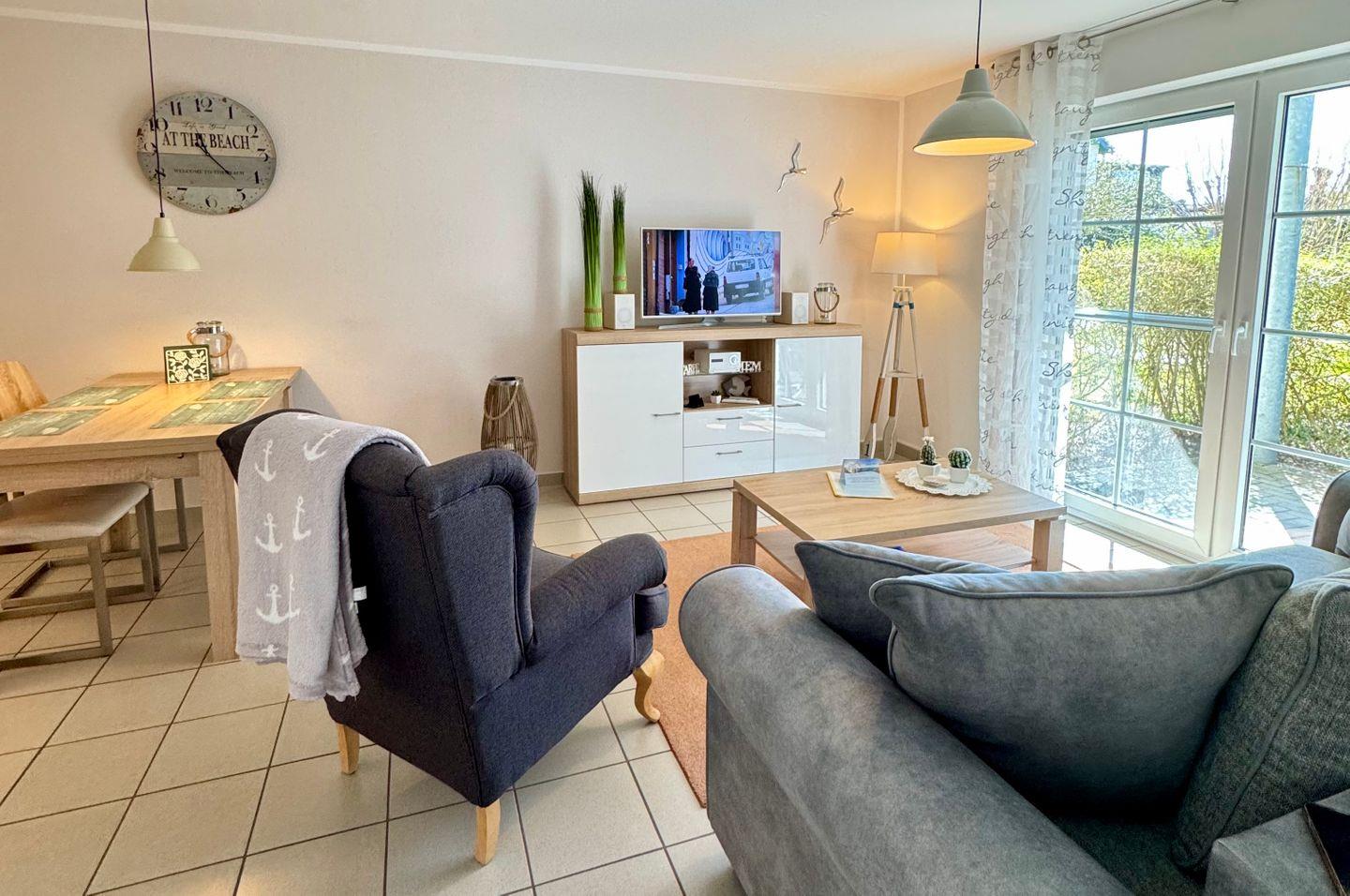 Die in exzellenter Strandlage im Erdgeschossbereich befindlichen 60qm² große Wohnung hat 1 Schlafzimmer, ein großzügiges Wohnzimmer mit Wohn-Schlafsofa, sowie ein Ess- und Küchenbereich. Vom separaten Flur gelangen sie in ein Bad mit Dusche und WC ( im März 2024 saniert). Zur Wohnung gehört eine große sonnige Südwestterrasse( mit Fliegengitter). Bis zum Ostseestrand mit dem feinen Sandstrand sind es nur 50 m. Von dort aus kann man die malerischen Sonnenuntergänge genießen.