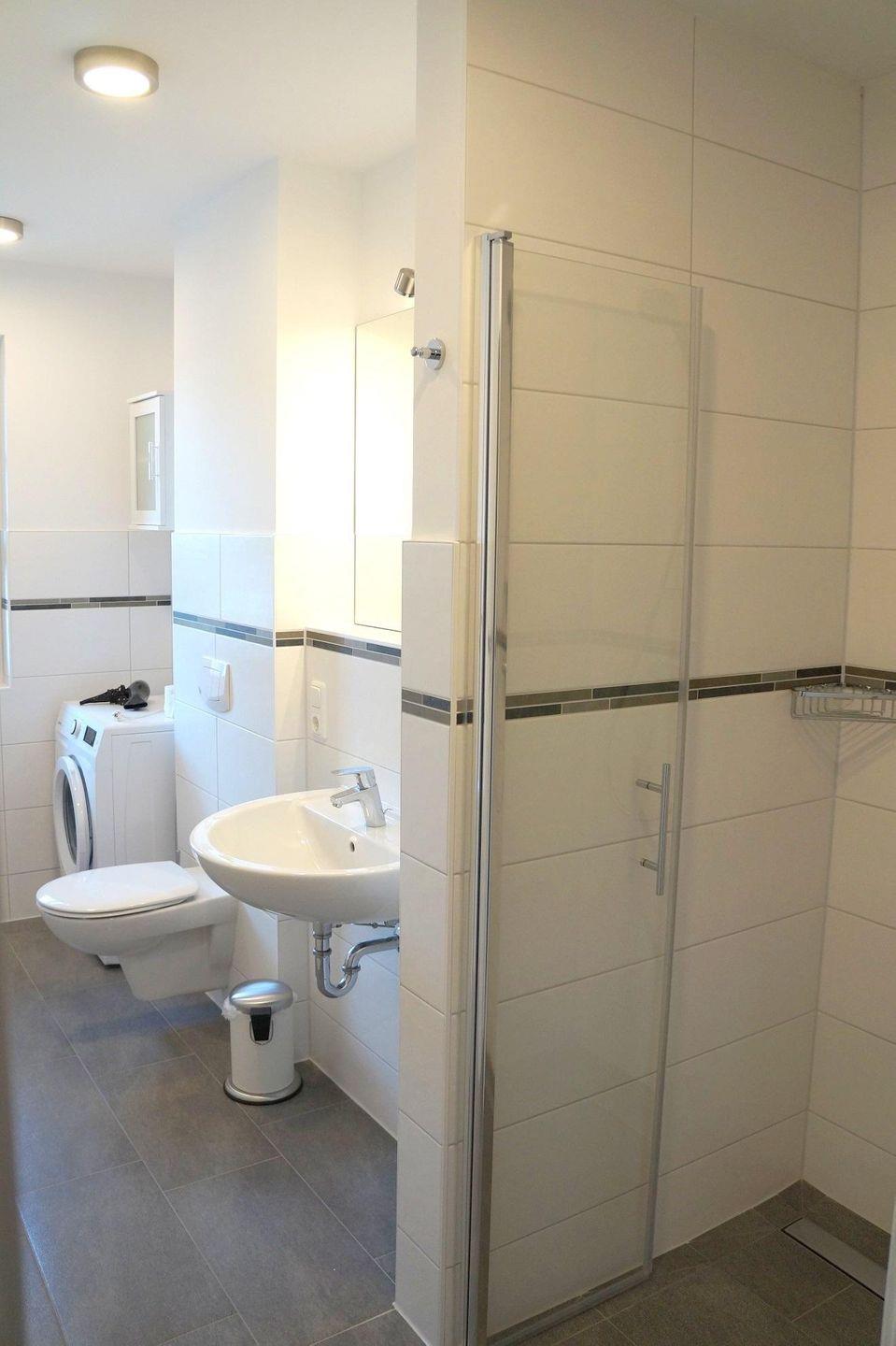 Im Bad gibt es eine bodengleiche Dusche/WC, Waschmaschine und Fußbodenheizung.