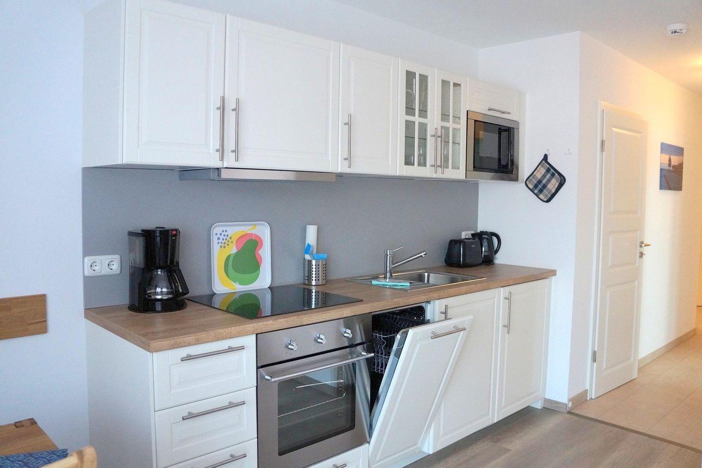 Die Wohnung verfügt über ein offenes Wohn- und Küchenkonzept. Eine voll ausgestattete Küche mit Ceranherd, Kühlschrank, Geschirrspüler, Backofen, Mikrowelle, Wasserkocher, Toaster und Kaffeemaschine lässt keine Wünsche offen.