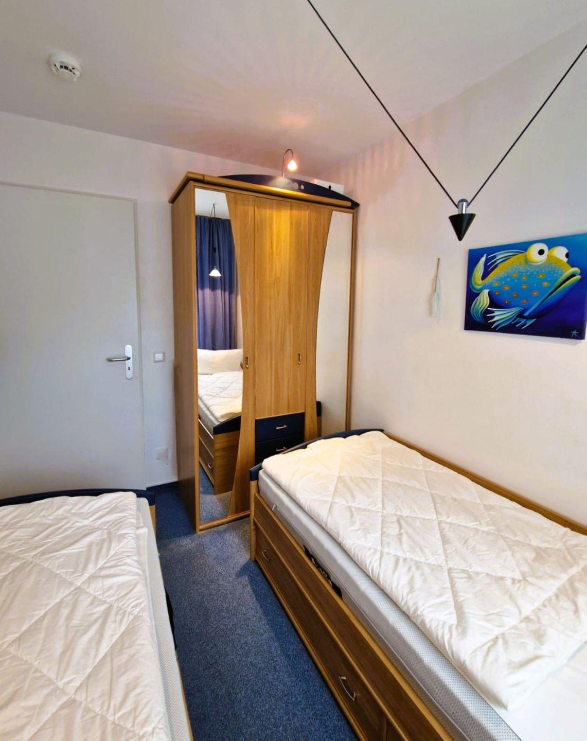 Im Wohnzimmer befindet sich eine Couch, im Schlafzimmer zwei Einzelbetten.