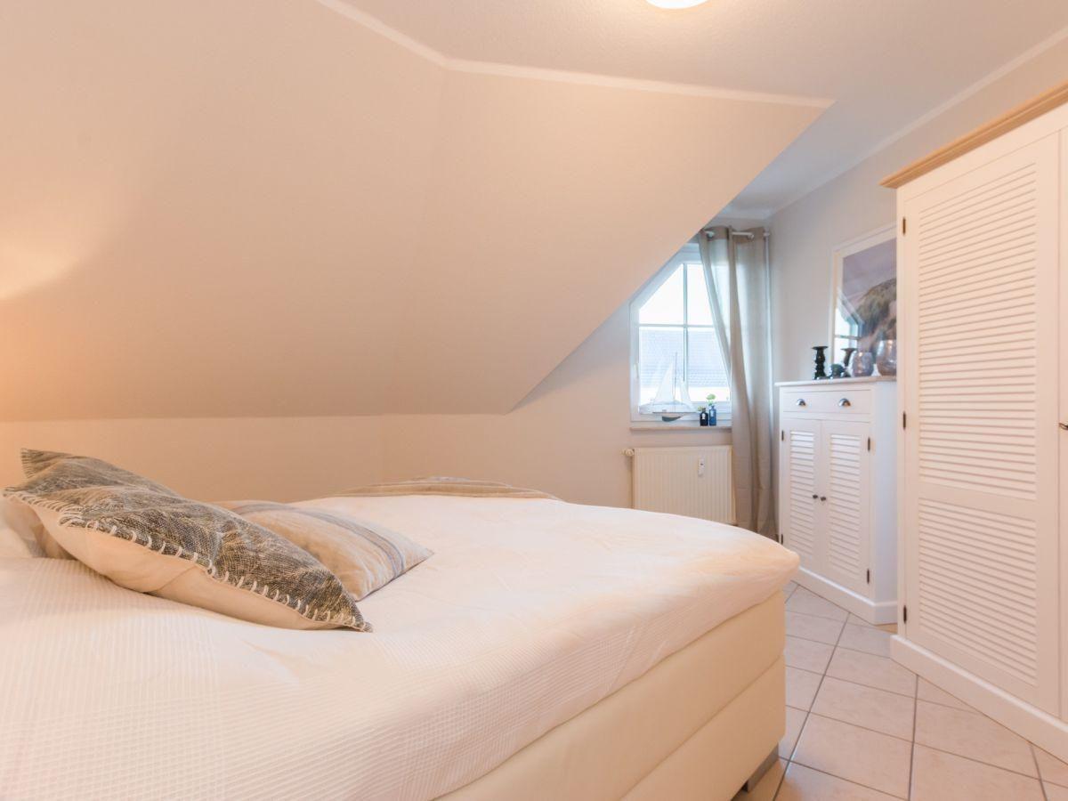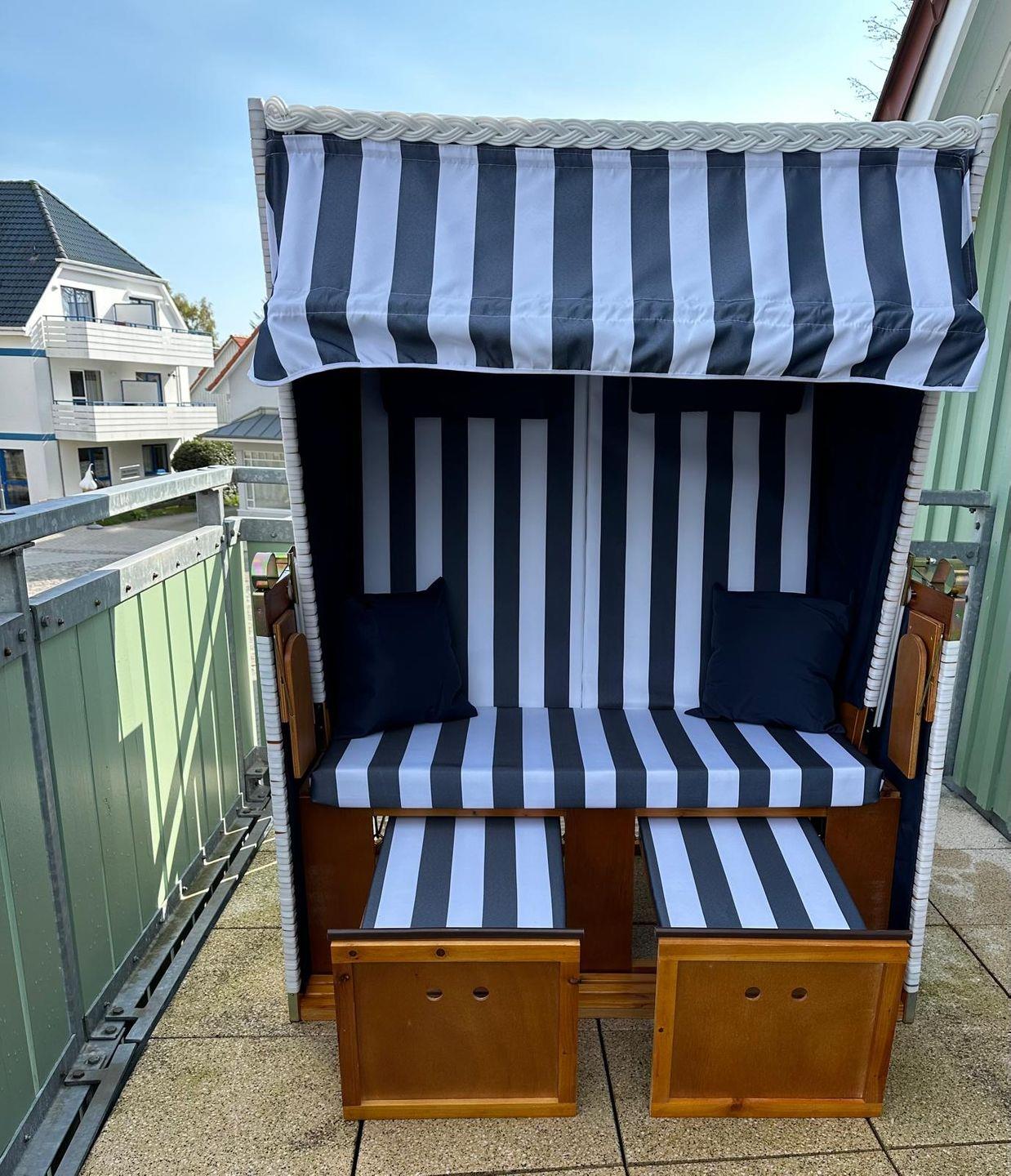 Die liebevoll maritim eingerichtete 43 m² Nichtraucher-Ferienwohnung für 2-3 Personen (2 Erwachsene mit einem Kind bis 16 Jahre) mit Wohnzimmer, voll ausgestatteter Küchenzeile, Schlafzimmer mit Boxspringbett, Schlafcouch, Bad, Westbalkon, Fahrradabstellraum und PKW-Stellplatz liegt zentral und nur 300m vom Sandstrand entfernt.