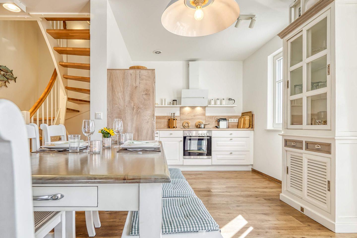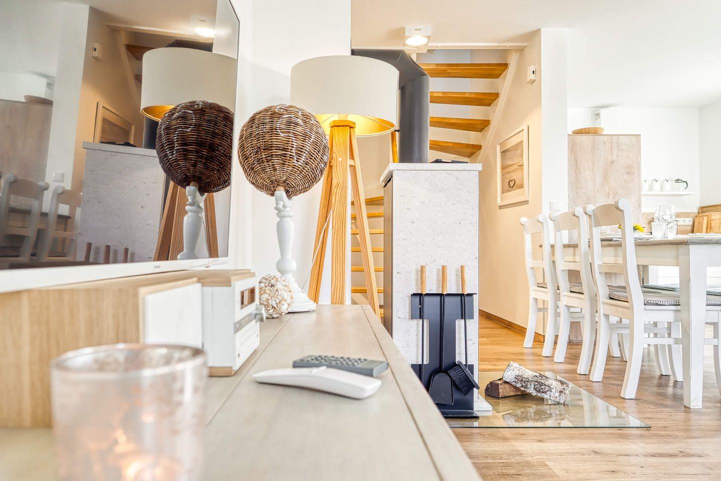 Ein großzügiger Wohnraum mit Wohn-/Essbereich ist hochwertig eingerichtet, LED-TV, Kaminofen, sowie mit einer kompletten Einbauküche ausgestattet inkl. Nespresso Maschine. Kostenfreies W-LAN inkl., im Hauswirtschaftsraum stehen Waschmaschine inkl. Trockner bereit.