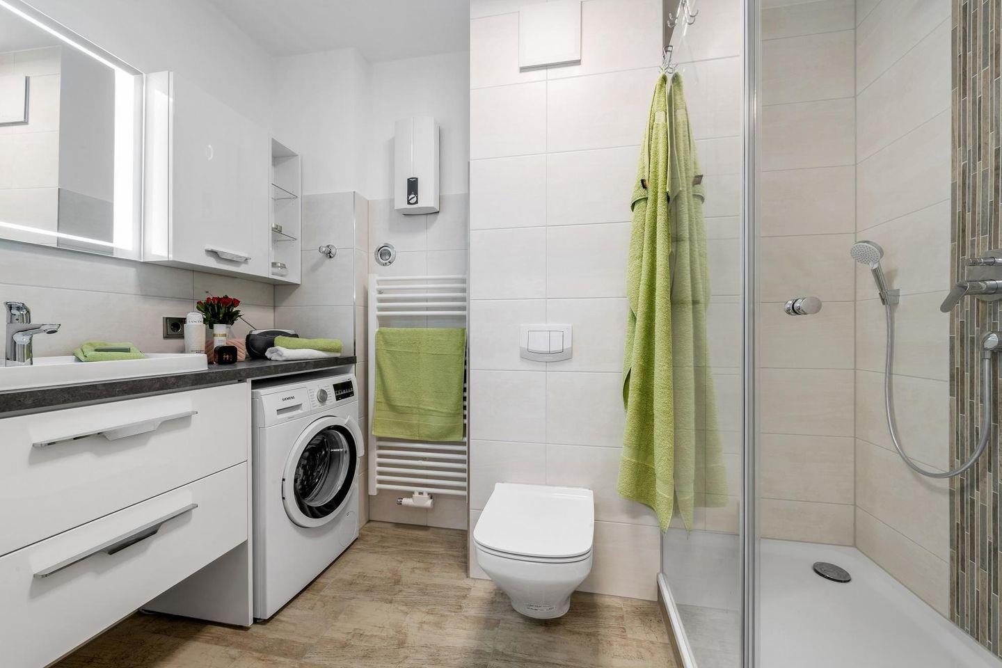 Ein besonderes Highlight der Wohnung ist der Balkon, der Ihnen frische Luft und einen Ausblick auf die umliegende Natur bietet. Genießen Sie dort bei einem Becher Kaffee die Morgenstrahlen oder entspannen Sie bei einem Glas Wein in den Abendstunden. Das Badezimmer ist mit einer Dusche und einer Waschmaschine ausgestattet.