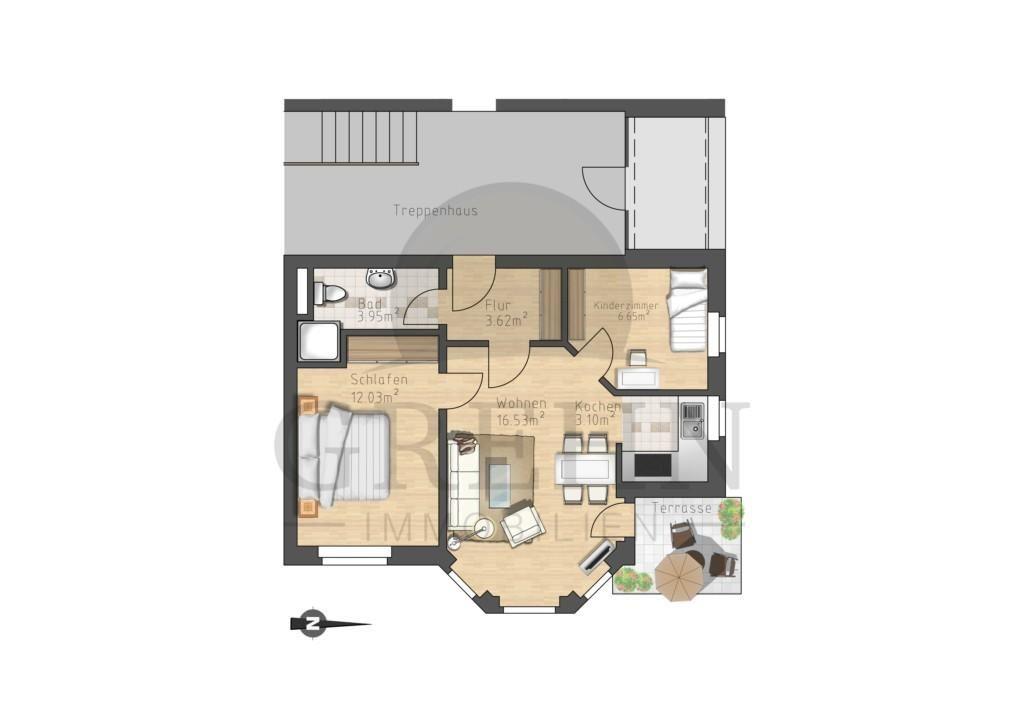 Ein weiteres nach Norden ausgerichtetes Zimmer kann als Schlaf- oder Kinderzimmer genutzt werden.