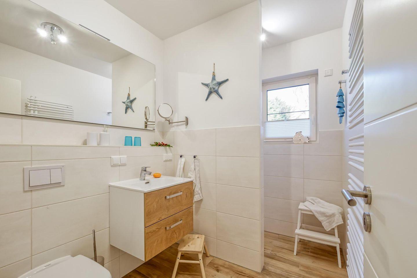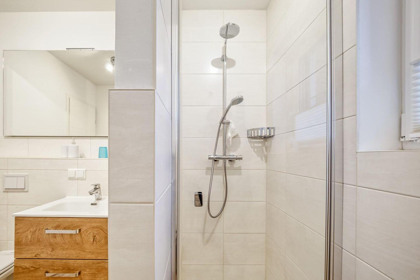 Das Badezimmer der Ferienwohnung bietet Ihnen neben einer Dusche mit WC, auch eine Waschmaschine.