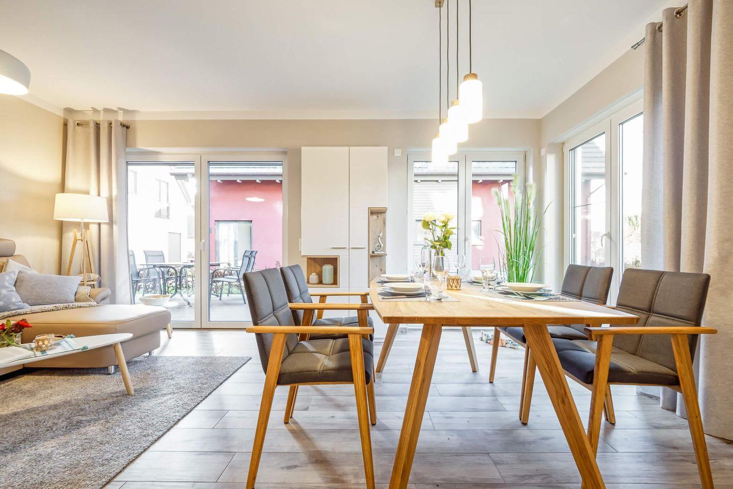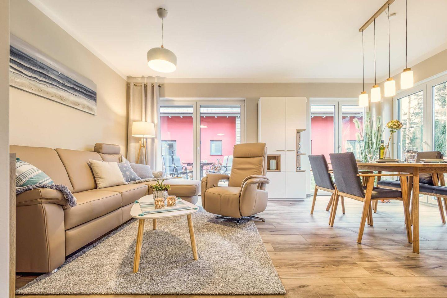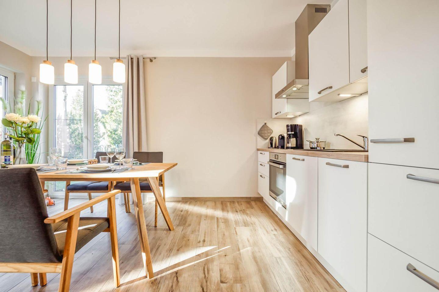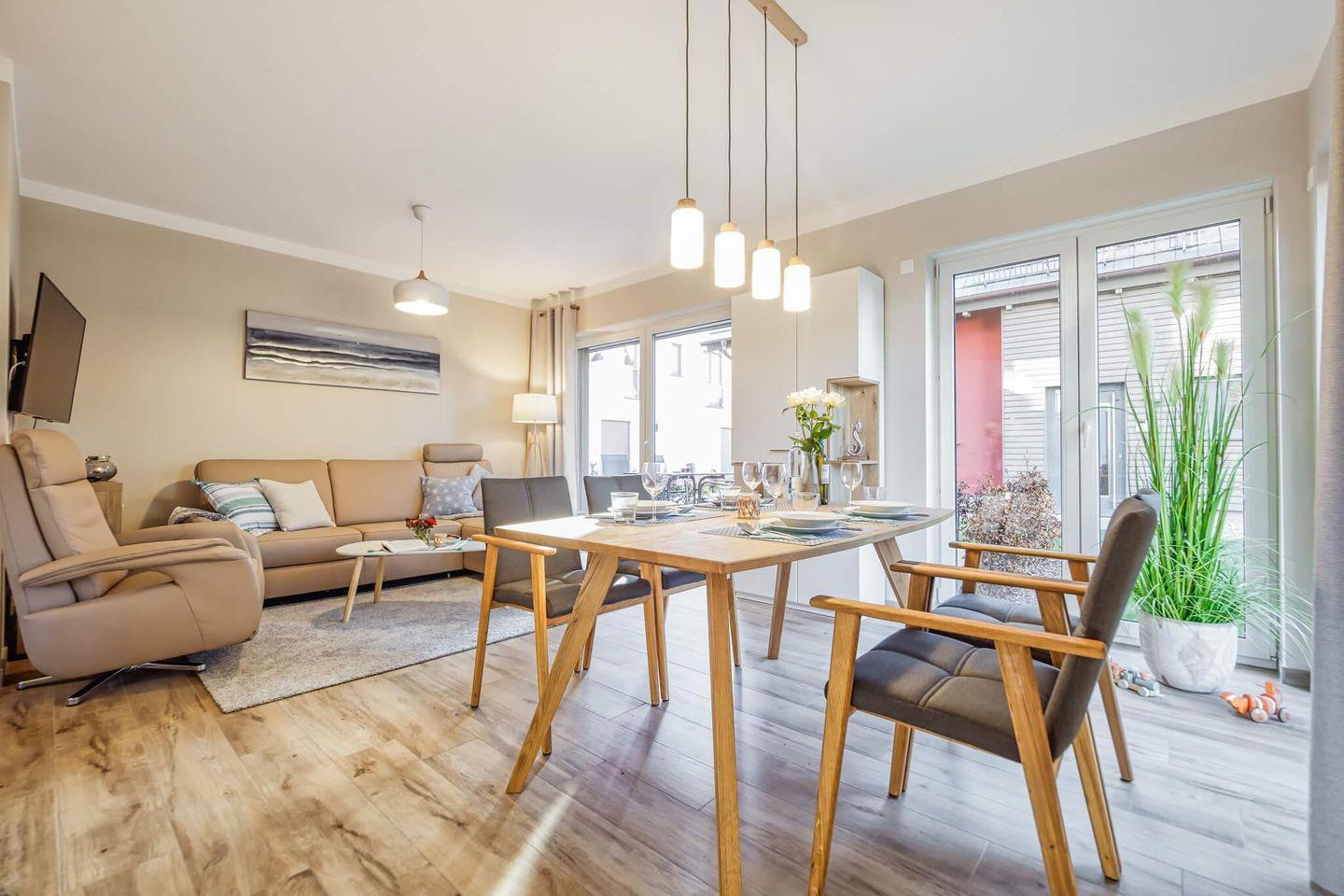 Freuen Sie sich auf einen hellen und gemütlich eingerichteten Wohn-, Ess- und Küchenbereich mit moderner Ausstattung.