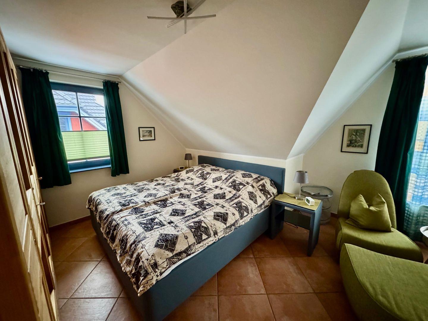 Im ersten Schlafzimmer im OG befindet sich ein Doppelbett (180 x 200 cm) mit zwei getrennten Matratzen. Das zweite Schlafzimmer im 1. OG verfügt ebenfalls über ein Doppelbett (180 x 200 cm) mit zwei getrennten Matratzen, einen großen Kleiderschrank, eine kleine Couch und einen Kindertisch.