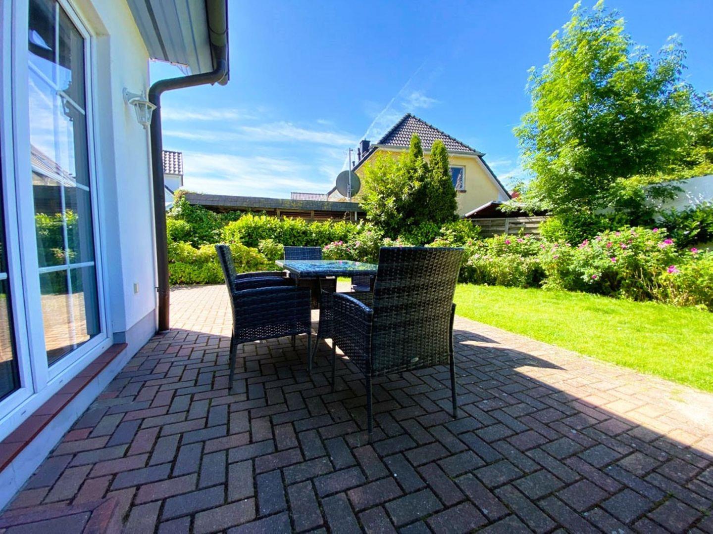 Der allseits umschlossene, nicht einsehbare Garten mit großer Süd-Terrasse lädt zu einem gemütlichen Frühstück genauso ein, wie zu einem entspannten Abend nach einem sonnigen Strandtag.