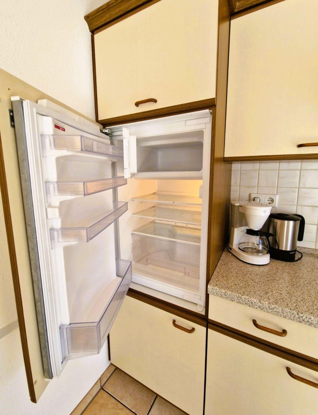 Die Küche ist voll ausgestattet mit Elektrogeräten wie einem Herd, Backofen, Kühlschrank, Geschirrspüler und einer Kaffeemaschine.
