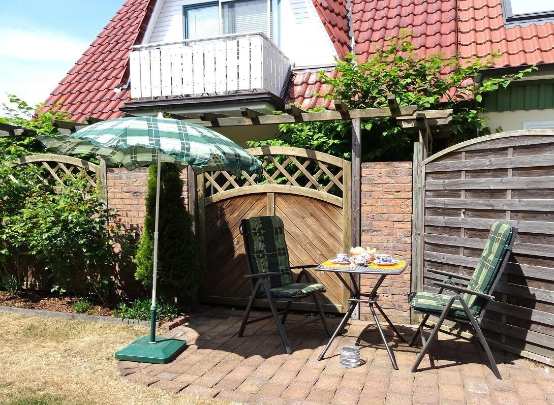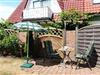 Fliegengitter in jedem Raum, Terrasse mit Terrassenmöbeln und Sonnenschirm