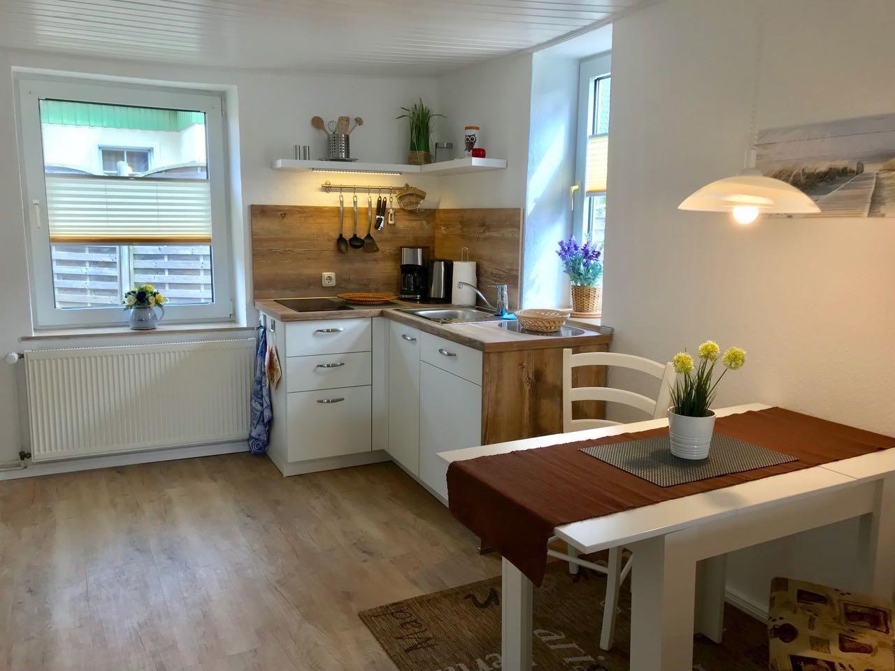 Fahrradgarage mit E-Anschluss für Ihre E-Bikes vorhanden, Wohnzimmer, SAT-TV, Radio mit CD-Player, Bad mit Dusche/WC, Fön, Handtuchtrockner, Kosmetikspiegel, Schlafzimmer mit Ehebett, Küche mit 2 Induktionskochplatten und Kühlschrank mit Frostfach, Kaffeemaschine, Toaster, Wasserkocher, Fliegengitter in jedem Raum, diese Wohnung ist nur für 2 Personen zugelassen, W-Lan