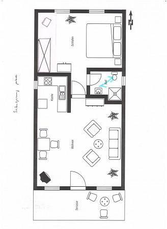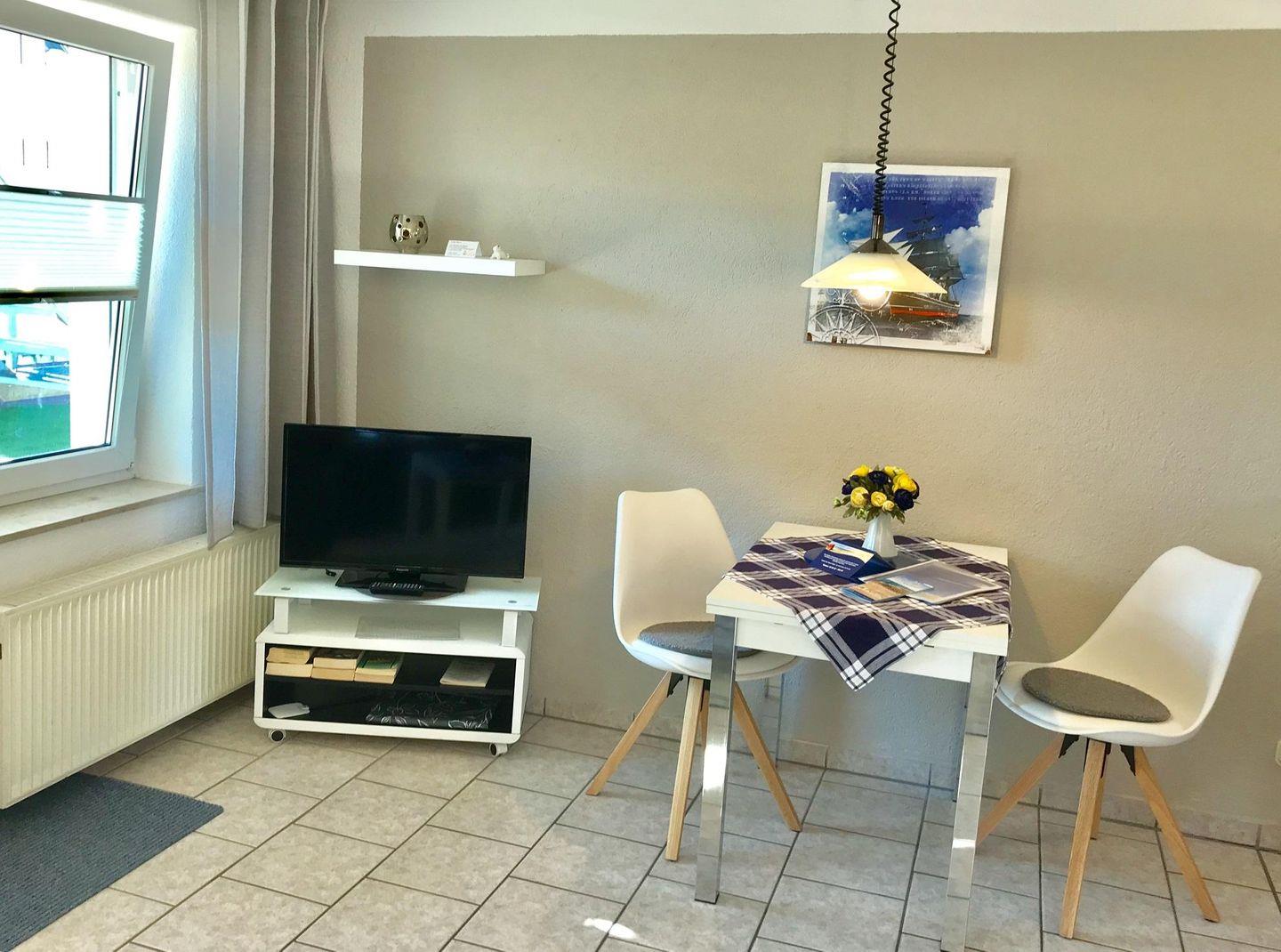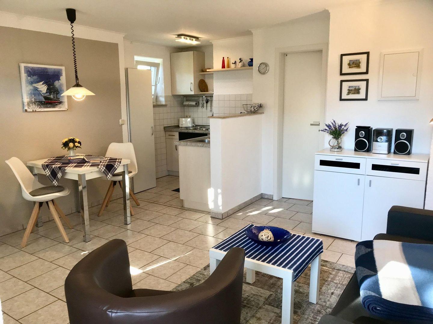 Wohnzimmer mit Schlafsofa, SAT-TV, Radio mit CD Player, Küchenzeile (E-Herd mit Backröhre, Kaffeemaschine, Toaster, Wasserkocher, Kühlschrank mit Frostfach), Schlafzimmer mit Ehebett, Dusche/WC, Fön, Kosmetikspiegel, Handtuchtrockner, Schranksafe, eine Aufbettung mit einem Kinderreisebett ist leider nicht möglich.