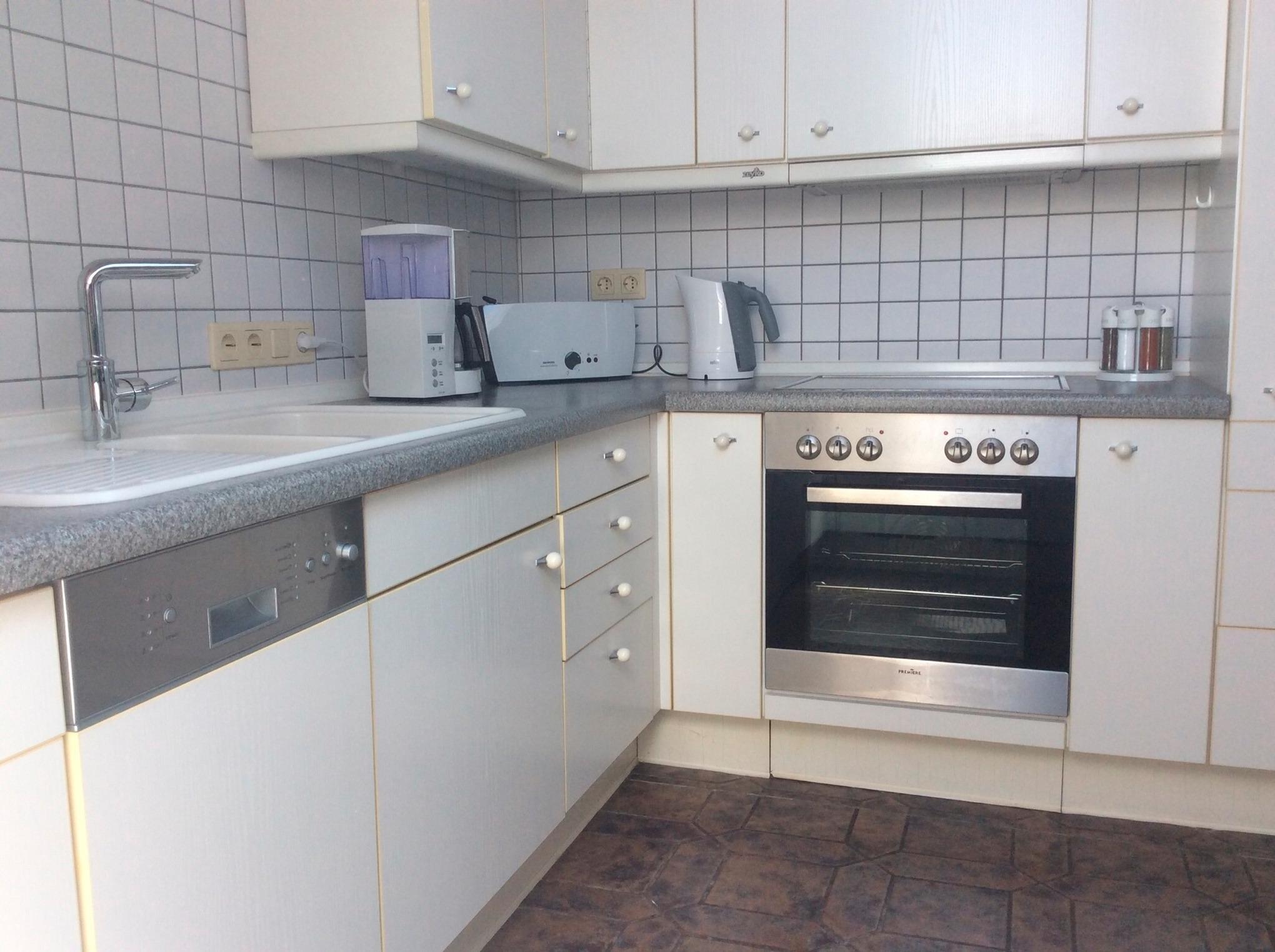 - große, komplett eingerichtete Küche ( Teller, Tassen Gläser, Besteck, Toaster, Kaffeemaschine, Mikrowelle) incl. Herd, Kühlschrank mit Gefrierfach und einem Geschirrspüler